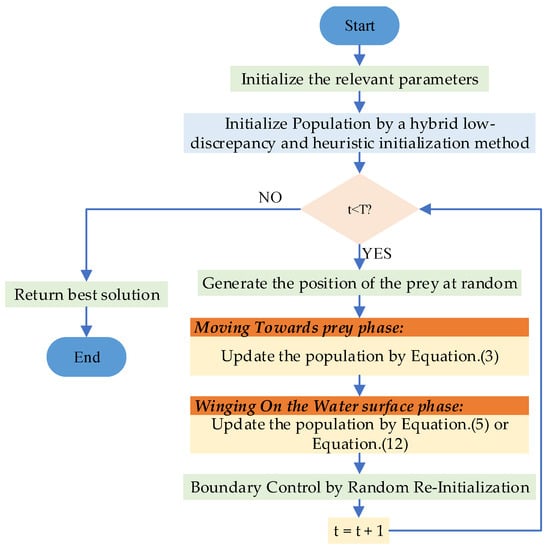 | 1: Begin 2: Initialize population by a hybrid low-discrepancy and heuristic initialization method. 3: While do 4: Generate the position of the prey at random. 5: For 6: For 7: Moving towards prey (exploration phase): 8: Update the population by Equation (3) 9: End For 10: Update the member in the population by Equation (4) 11: End For 12: For 13: For 14: Winging on the water surface (exploitation phase): 15: Update the population by Equation (12) 16: End For 17: Update the member in the population by Equation (6) 18: End For 19: Boundary Control by Random Re-Initialization 20: 21: Update best solution 22: End while 23: return best solution 24: end |