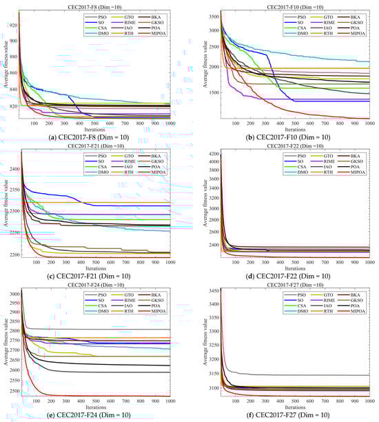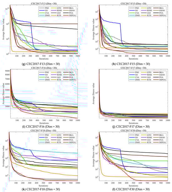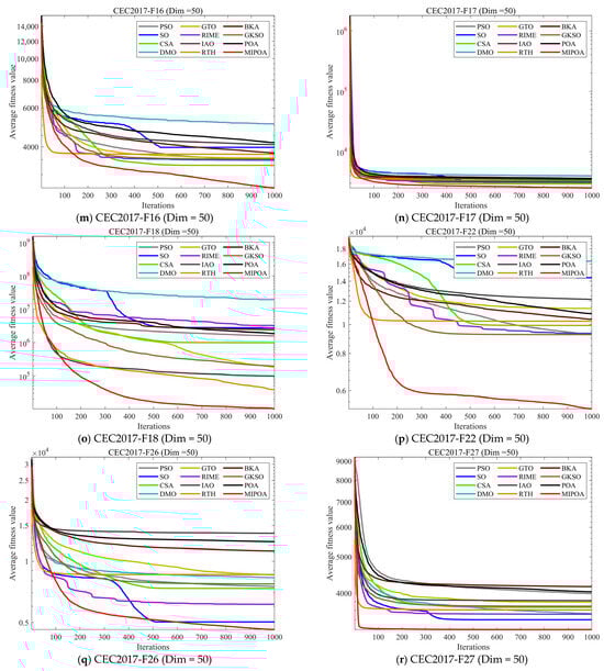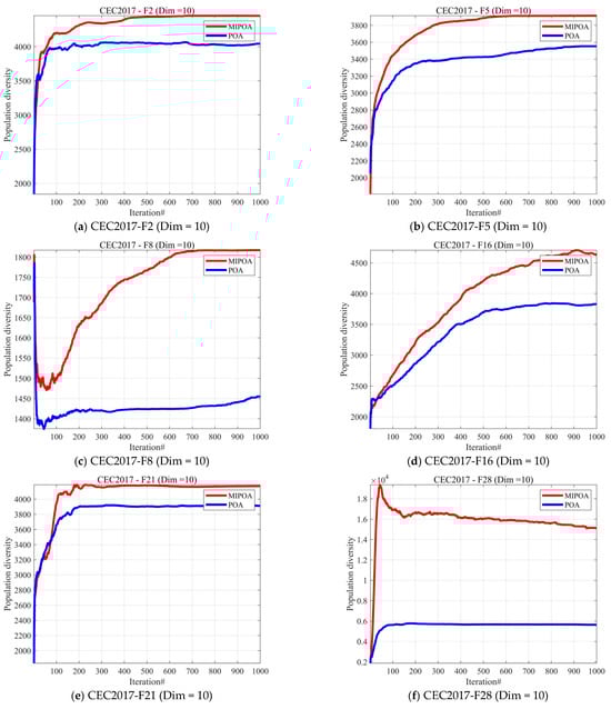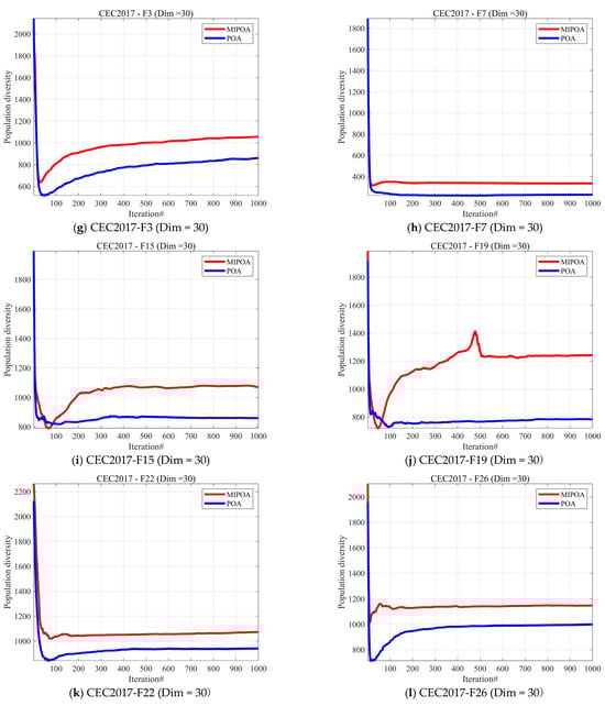 Figure 2 presents the experimental results of the MIPOA and POA across three dimensions on the CEC2017 test set. Overall, MIPOA maintains significantly higher diversity levels than POA across all evaluation metrics. Notably, in the 10-dimensional setting, the gap between MIPOA and POA is particularly pronounced in F16 and F28, demonstrating its superior global exploration capability and ability to escape local optima. In contrast, POA’s diversity rises rapidly in the early stages before stabilizing at a relatively low overall level, posing a risk of premature convergence. In the 30-dimensional setting, MIPOA demonstrated overall higher population diversity compared to POA, with a more pronounced advantage on complex and multi-modal functions (e.g., F19). This indicates its superior global exploration capability and effectiveness in avoiding premature convergence. However, the gap was smaller on some simpler functions (e.g., F7), suggesting that the enhancement of population diversity under high-dimensional conditions is more prominent in complex scenarios.
