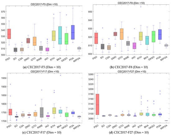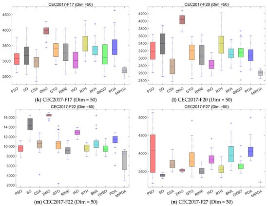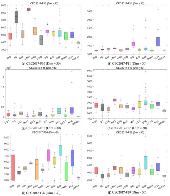 To evaluate MIPOA’s performance, we assessed it using the CEC2017 test set. Comparisons were made against 11 other state-of-the-art algorithms, with experimental analysis conducted using the mean and standard deviation from 30 independent runs. Furthermore, to compare the convergence rates of each algorithm, Figure 3 presents the experimental results of MIPOA and the comparison algorithms across three dimensions on the CEC2017 test set. To further analyze the algorithm’s performance, Figure 4 displays box plots from 30 independent runs, providing a comprehensive analysis of the results from each run. Table A2, Table A3, and Table A4, respectively, present the performance metrics of the 12 algorithms across three dimensions on the CEC2017 test set. Here, “mean” denotes the average of 30 independent runs, while “std” represents the standard deviation of the algorithm’s 30 independent runs. The data in the table indicates that MIPOA achieved the best results among the 12 algorithms, with the most significant improvement observed when compared to POA.