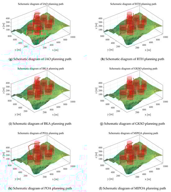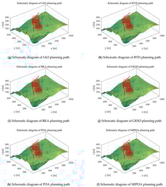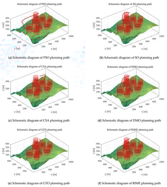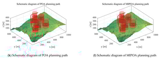 As can be seen from Figure 4, the MIPOA demonstrates outstanding convergence advantages: First, it exhibits a rapid convergence rate during the early stages of iteration, with the average fitness value decaying quickly. Second, it converges stably to a low fitness level in the later stages of iteration, reflecting strong optimization accuracy and convergence stability. In contrast, algorithms such as PSO, SO, and CSA exhibit slower convergence speeds on certain functions and converge to relatively high final fitness values, resulting in comparatively inferior convergence performance. It is worth noting that for simple functions, most existing algorithms exhibit excellent performance, finding the optimal solution in a relatively small number of iterations. Therefore, MIPOA’s performance improvement on simple functions is limited. However, for complex functions, existing algorithms often struggle to find the global optimum. This is where MIPOA’s advantage becomes apparent, as it effectively escapes local optima to achieve the global optimum. More importantly, the three-dimensional UAV path planning problem addressed in this paper is a complex problem, making the performance improvement of MIPOA on complex functions even more significant.