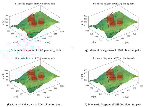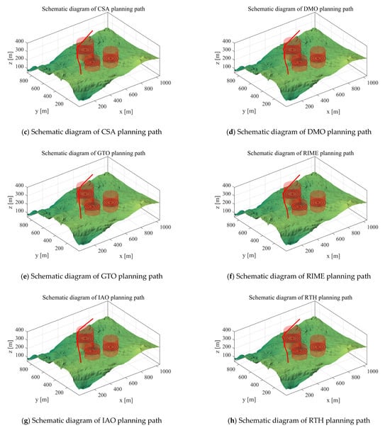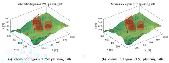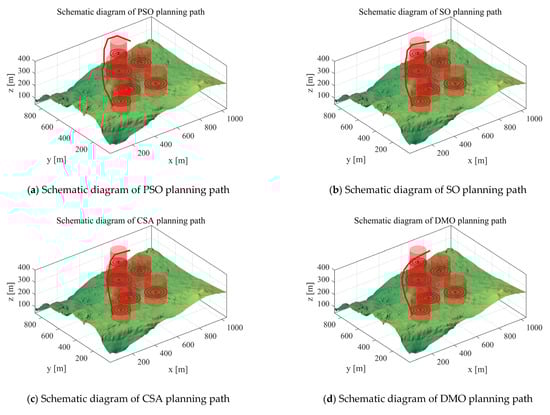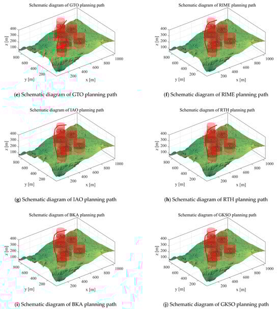 Intelligent optimization algorithms are designed based on the principle of “emulating natural laws,” encompassing classic methods such as the Particle Swarm Optimization (PSO) [], Genetic Algorithm (GA) [], and Ant Colony Optimization (ACO) []. By simulating biological group collaboration and natural selection processes, these algorithms efficiently search for optimal solutions within vast path solution spaces. For example, Hu et al. proposed a sand cat algorithm incorporating learning behavior that employs cubic B-spline interpolation to generate smooth paths for drone path planning, thereby devising a safe and feasible route while minimizing cost considerations []. Addressing the challenge of drone path planning in complex mountainous terrain, Lv et al. proposed a more practical path planning model by comprehensively considering constraints such as natural terrain and collision threats from obstacles, minimum path length, and flight altitude []. Building upon the concept of symmetry, they optimized the population initialization method and introduced an improved Beetle Optimization (IDBO) algorithm. This approach effectively reduces UAV energy consumption costs and collision risks while enhancing path planning efficiency and accuracy. Zhang et al. proposed an improved artificial fish school algorithm (IAFSA) to address the issues of uneven population distribution and susceptibility to local optima in traditional artificial fish school algorithms [], specifically for solving UAV three-dimensional path planning problems. Experimental results demonstrate that IAFSA exhibits high global convergence capability and speed.