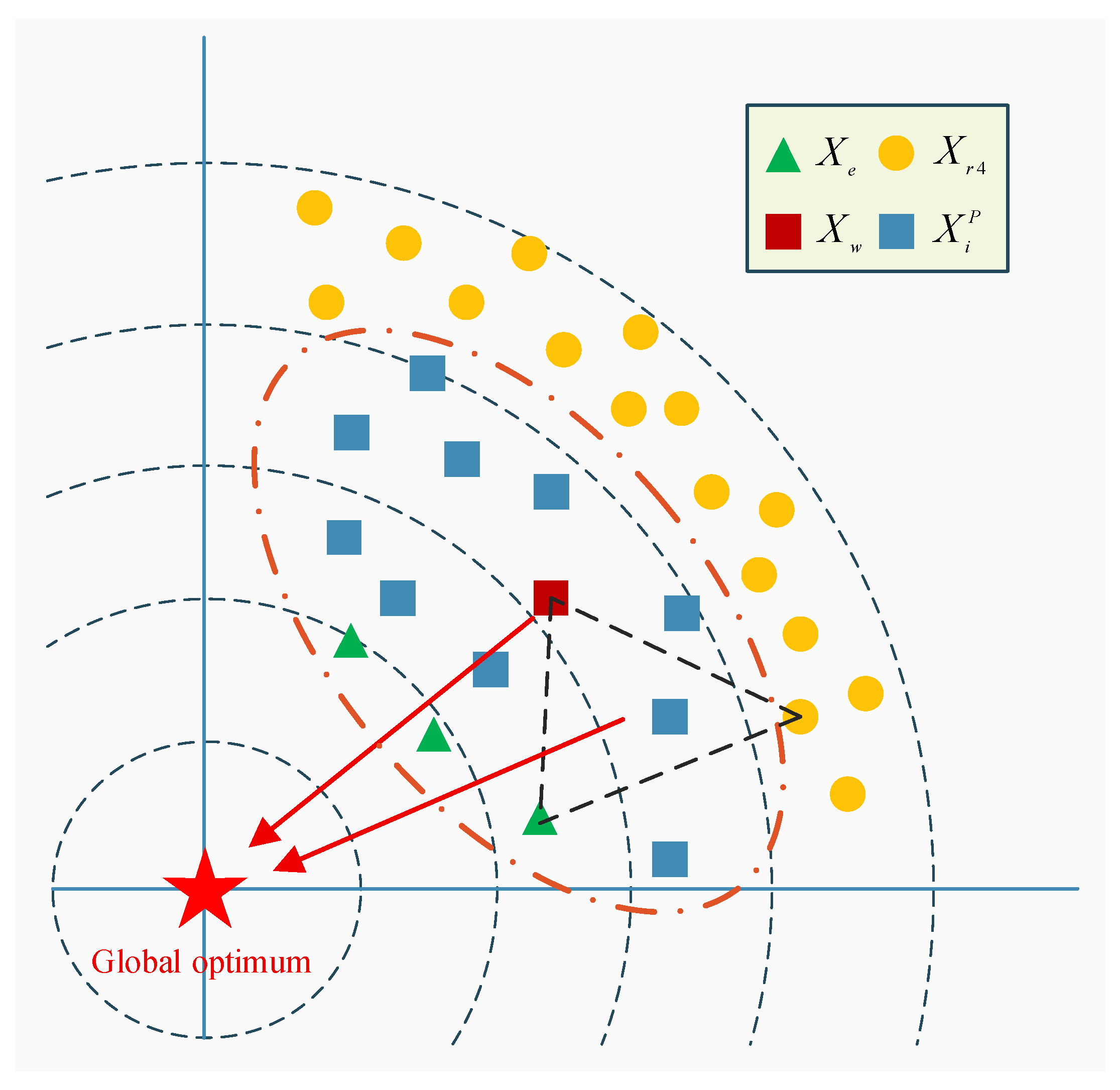 Figure 1, the dominant group drives the population toward promising regions, the top three randomly chosen individuals supply alternative directions while accelerating convergence, and the random agent enlarges the set of possible search orientations; consequently Equation (14) markedly improves individual quality and strengthens global exploration, whereas Equation (13) speeds up convergence yet still preserves the possibility of correcting the search direction.