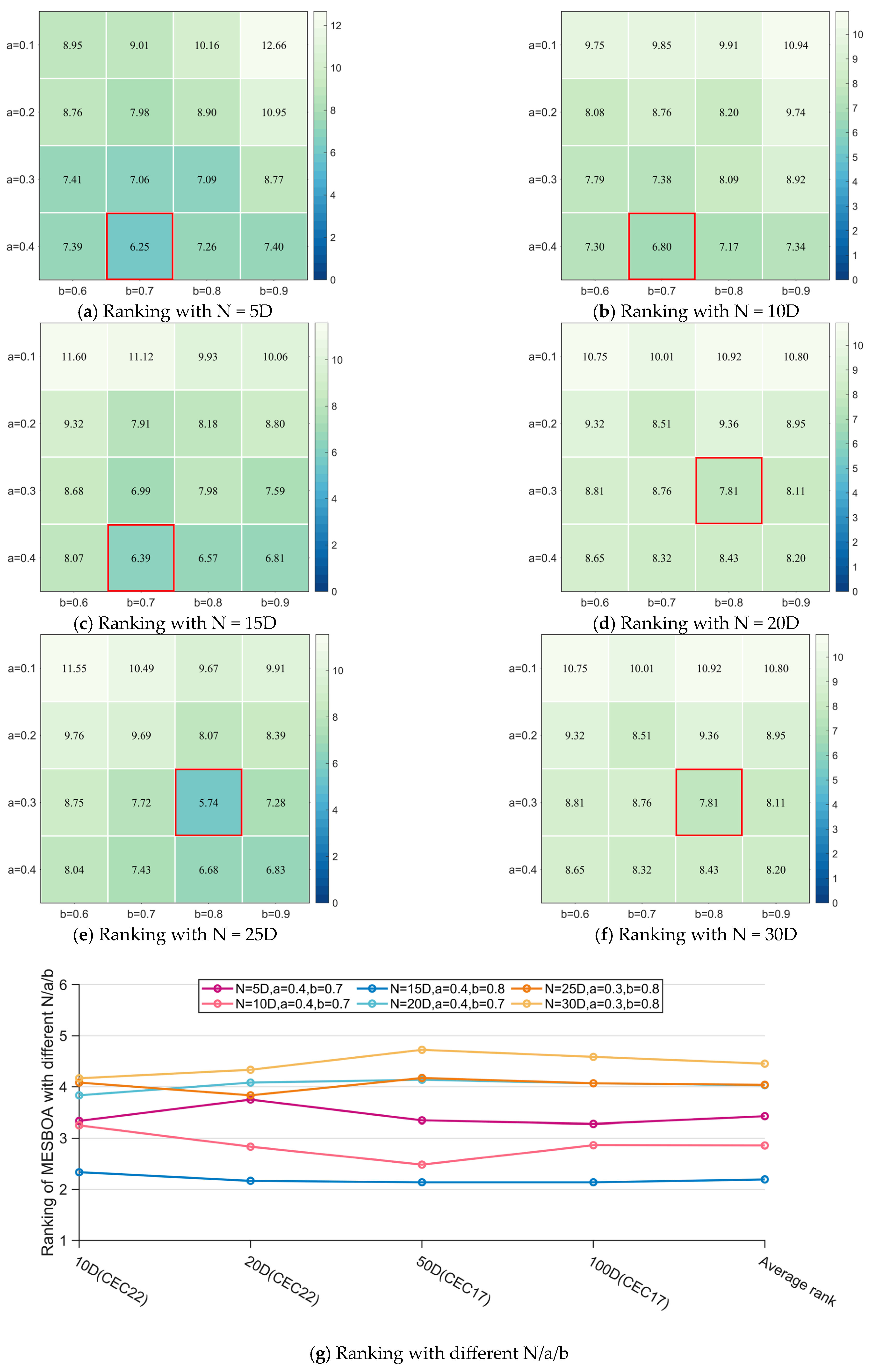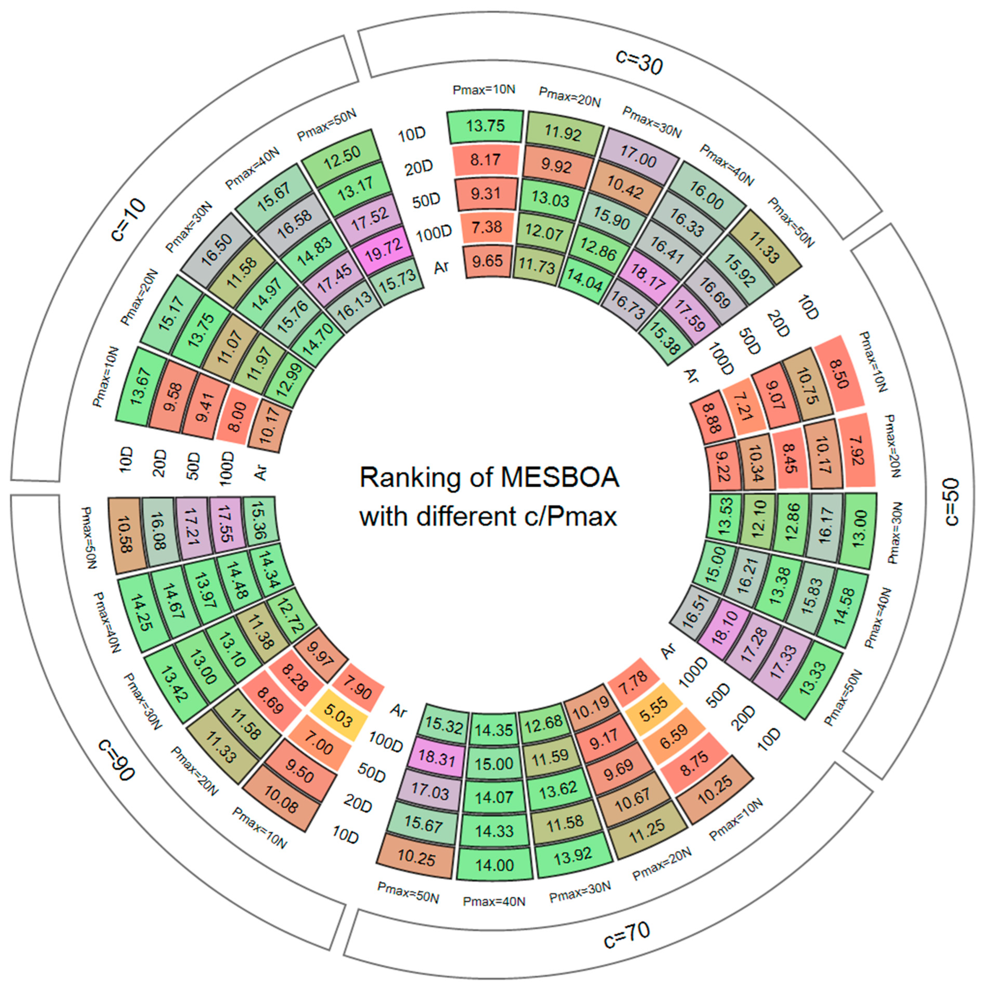 Figure 5 reports the Friedman ranks of MESBOA with different parameter pairs across all tested dimensions, where a lower average rank (Ar) indicates better overall performance. In