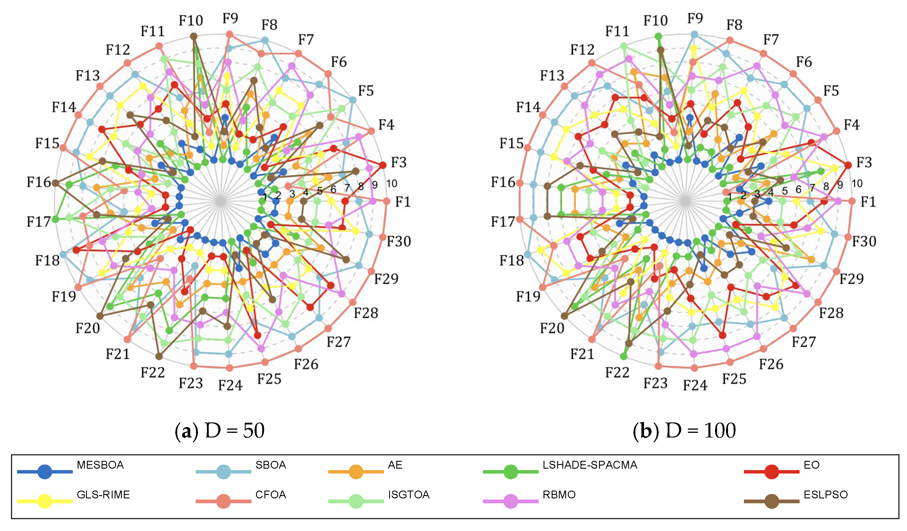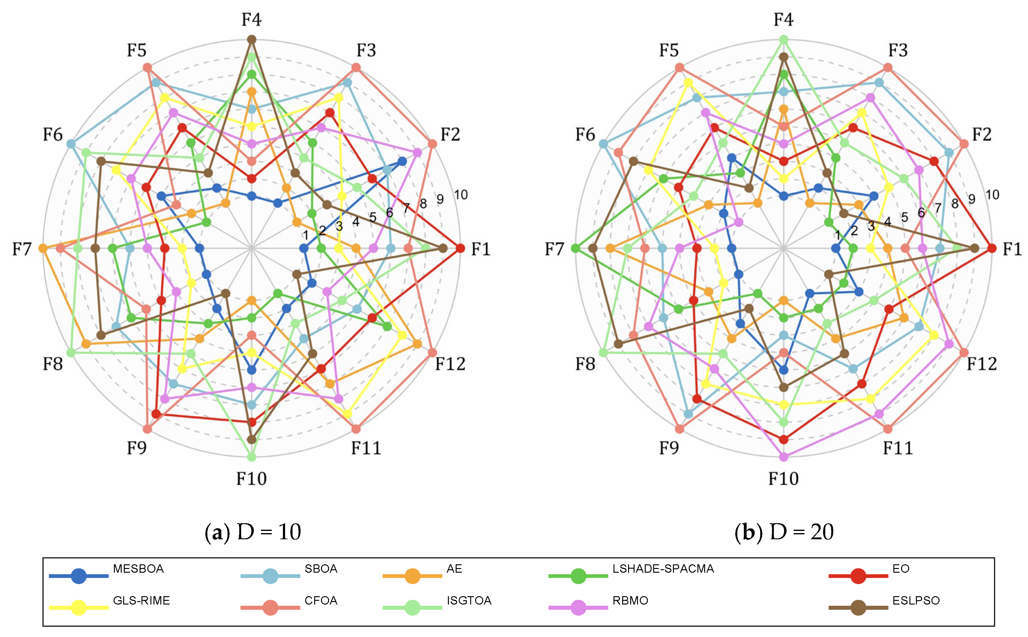 Appendix A. In the radar chart of rankings, each algorithm connects its ranks on the different functions into one surface; the smaller the enclosed surface, the better the overall performance. As can be seen, the surface produced by the proposed MESBOA is the smallest, demonstrating its superior overall performance. The surfaces of ESLPSO and ISGTOA are similar in size but exhibit poorer smoothness, indicating relatively weak stability and search efficiency. Although SBOA shows small fluctuations, its area is still large, confirming its poor overall performance.