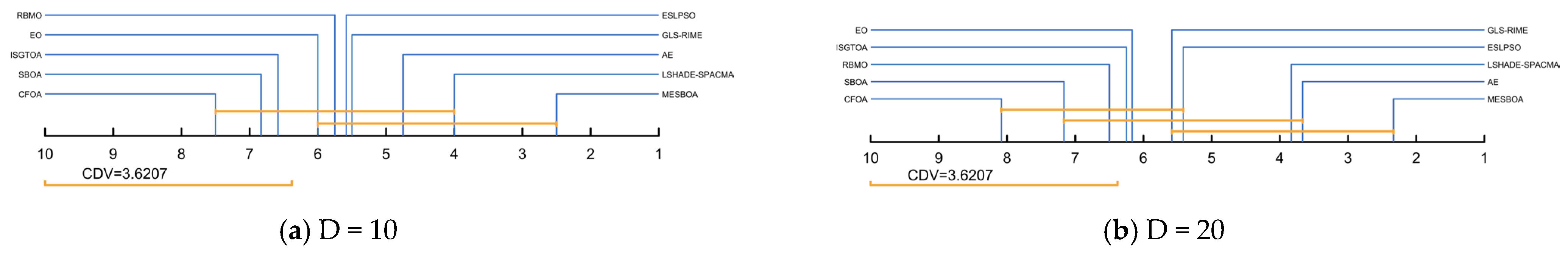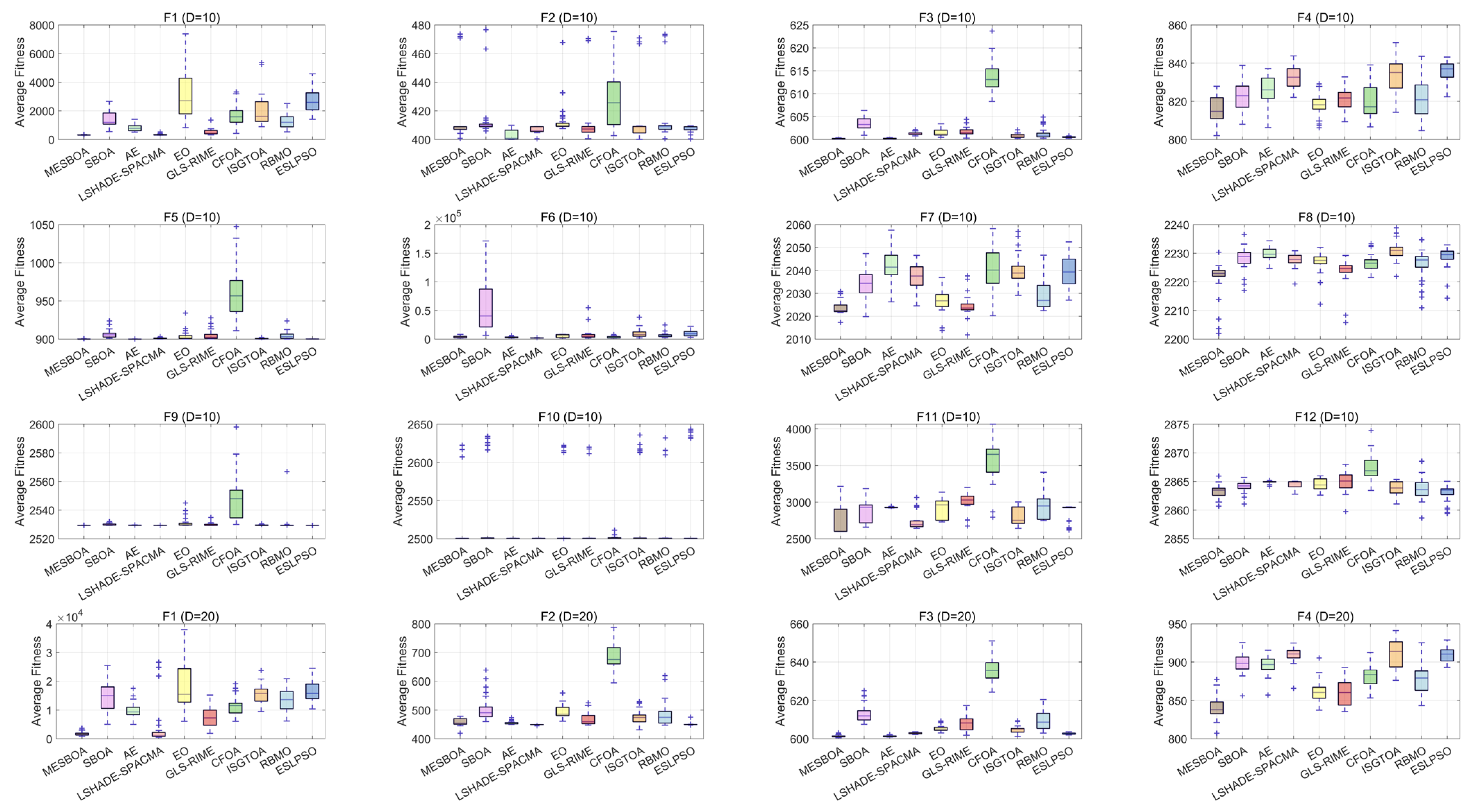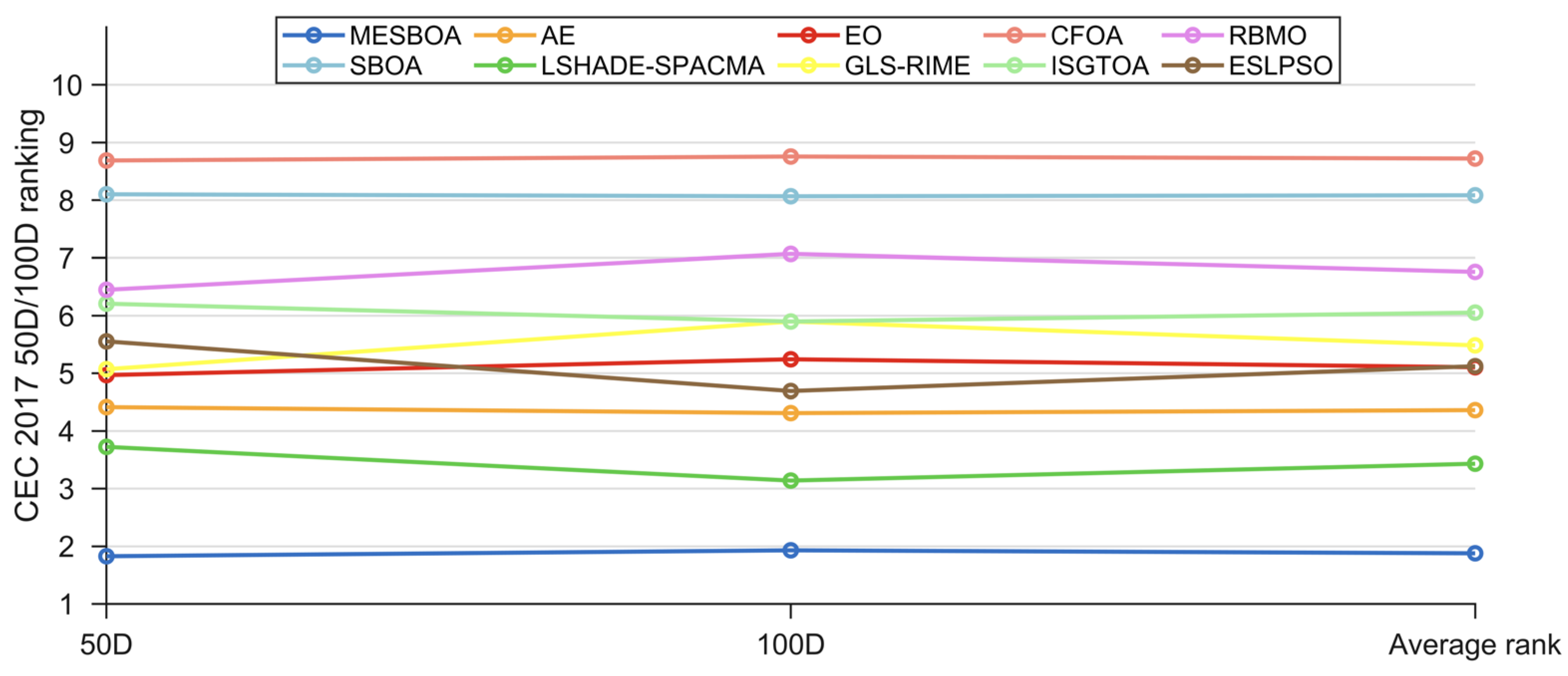 Figure 6 shows the average rankings of MESBOA, AE, LSHADE-SPACMA, EO, GLS-RIME, CFOA, ISGTOA, RBMO and ESLPSO when solving the 10-D/20-D functions. The complete data of the best, mean and standard deviation values are provided in
