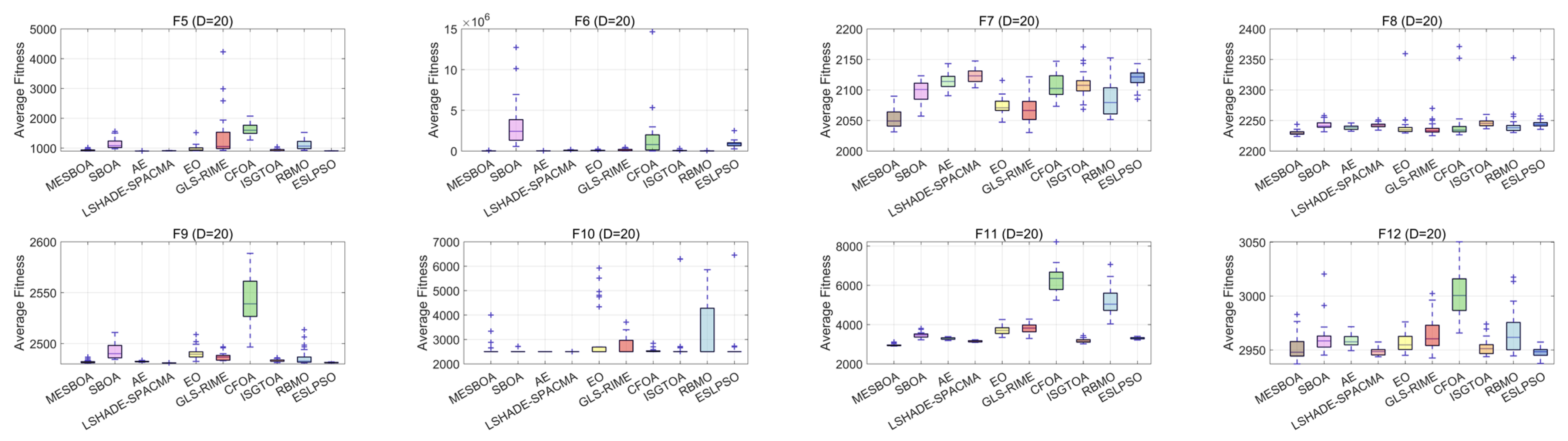 Figure 8 shows, MESBOA delivers excellent convergence. For the unimodal F1, all algorithms continue to converge, yet MESBOA exhibits the fastest speed and the highest accuracy, whereas the original SBOA descends much more slowly and attains a poorer final value. This superior performance on unimodal landscapes is attributed to MMS, which reconstructs the search framework so that dominant birds keep exploiting promising regions, and to EGS, which intensifies exploitation exactly when the population needs it; the synergy of the two mechanisms markedly strengthens MESBOA’s local search capability. On multimodal functions F2–F5, MESBOA is not always the most accurate on F2–F3 and F5, yet it converges faster and consistently yields higher-quality solutions than the basic SBOA. On F4 its convergence is slower, but the algorithm keeps escaping local optima and continues to discover better points. Compared with the original SBOA, MESBOA maintains a steady convergence curve, rarely stalls, and even accelerates in the later search phase. These improvements are credited to the supplementary role of the inferior group defined by MMS; by enlarging the search scope it helps the swarm jump out of local traps. In addition, EGS preserves population diversity through multiple guiding points, which further protects MESBOA from premature convergence. On the more challenging F6–F12, MESBOA attains the highest convergence accuracy on 10-D F7–F8, 20-D F7–F8 and F11. For the remaining functions except F10, it may not deliver the best final value, yet it always exhibits a rapid convergence rate; on F10 its speed and accuracy are not the top but they still surpass those of the basic SBOA. These results confirm that MESBOA possesses a well-balanced exploration–exploitation capability, owing to the fact that EGS dynamically detects the swarm’s current demand and drives each dimension to search accordingly. Overall, MESBOA demonstrates the best convergence behavior among all contenders on low-dimensional optimization problems.