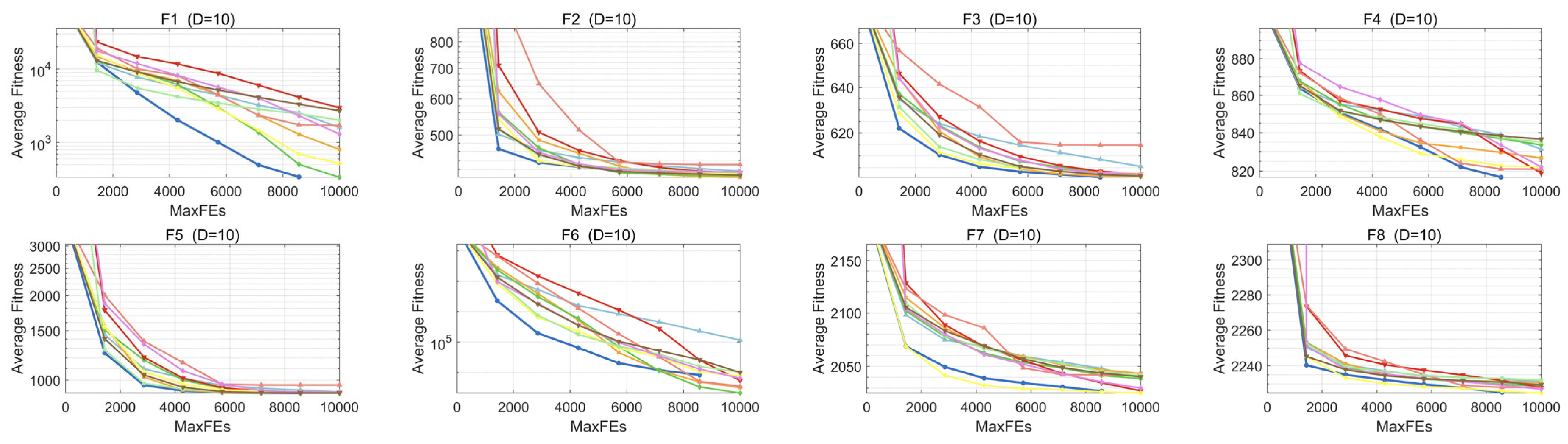 The experiments are realized on MATLAB 2021b in a Windows 11 environment. The platform has 32 GB RAM and an AMD R9 7945HX processor. To guarantee fairness and persuasiveness, all algorithms compared in the performance tests were run on identical data sets, the maximum number of function evaluations was fixed at 1000 D, and every algorithm was executed over 30 independent trials; to reduce randomness, the minimum value (Min), average value (Avg), and standard deviation (Std) of each metric across the 30 runs was used for statistical analysis. Statistical significance was examined via Wilcoxon rank-sum test, Friedman test and Nemenyi test.