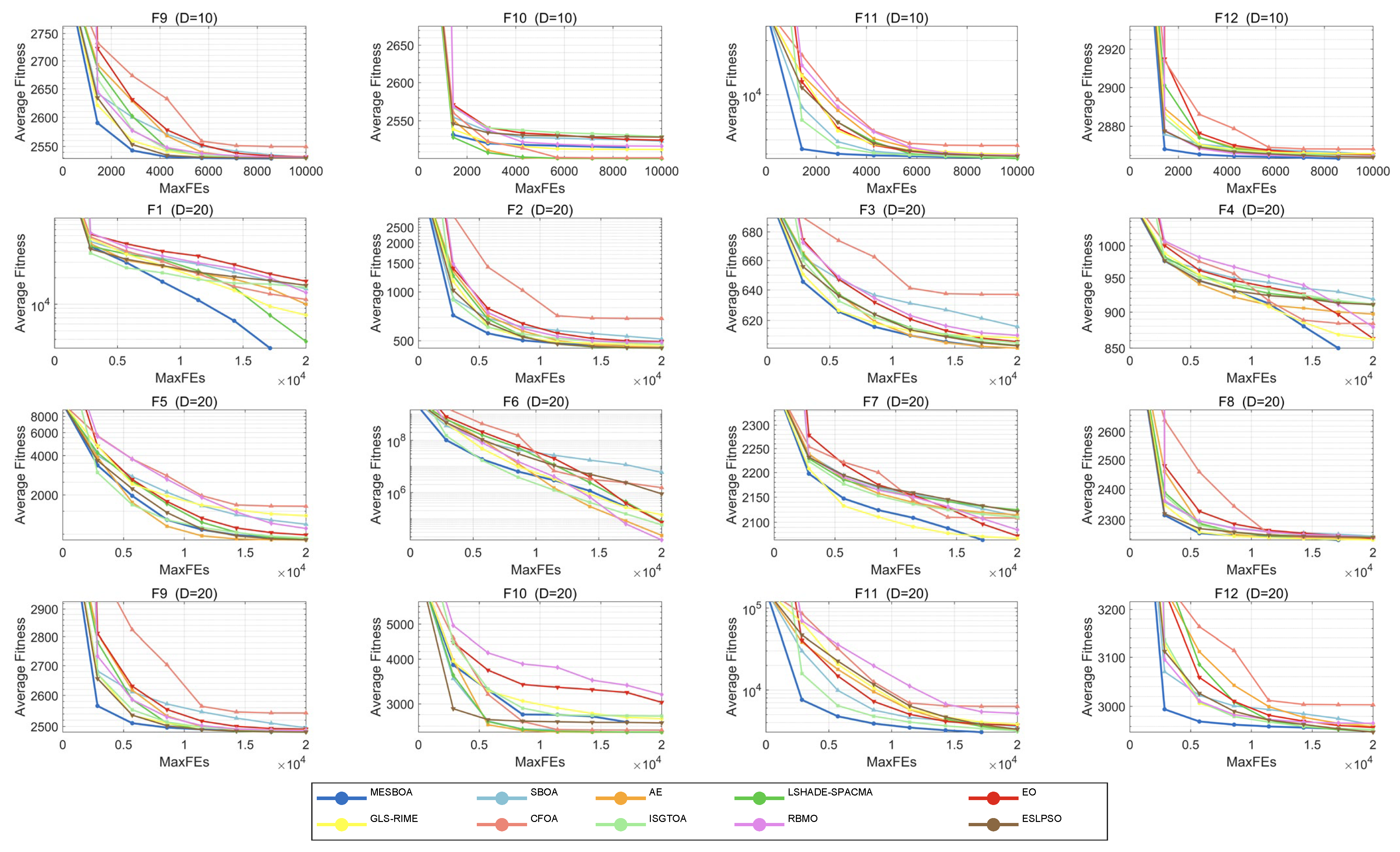 p-values confirm a significant global performance difference between MESBOA and all contenders. Specifically, MESBOA ranks first on both 10-D and 20-D problems, achieving mean ranks of 2.500 and 2.333, respectively, followed immediately by LSHADE-SPACMA and AE, while the original SBOA places second-to-last, outperforming only CFOA. Notably, although MESBOA’s superiority margin is smaller in 20-D than in 10-D, its absolute rank is actually better at 20-D because the rankings of nearly all improved algorithms rise with dimension, while those of the baseline methods fall; consequently, MESBOA’s relative advantage over the other enhanced variants does not increase even though its absolute rank improves. Nevertheless, MESBOA unquestionably delivers the best overall performance among all algorithms examined.