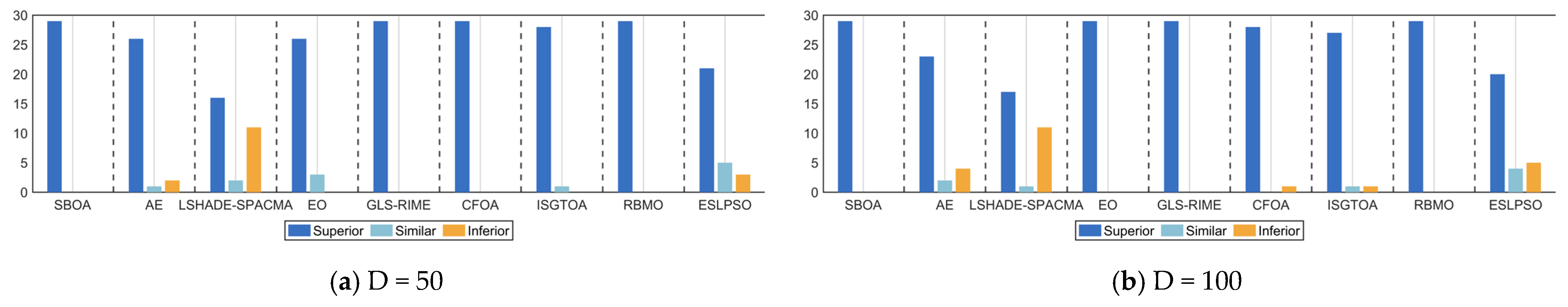 Figure 11. MESBOA registers significant superiority on at least 16 functions against every rival. Specifically, the counts of superior/(inferior) functions are 58(0) vs. SBOA, 49(6) vs. AE, 33(22) vs. LSHADE-SPACMA, 55(0) vs. EO, 88(0) vs. GLS-RIME, 57(1) vs. CFOA, 55(1) vs. ISGTOA, 58(0) vs. RBMO, and 41(8) vs. ESLPSO. Overall, MESBOA exhibits clear advantages on the majority of 50-D and 100-D functions.