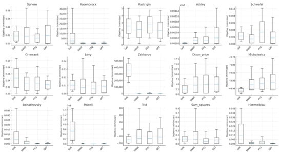 Formally, let denote the value of metric for algorithm on function . For each f and m, we sort in ascending order (since minimization is the goal) and assign ranks , with average ranks for ties. These ranks constitute the primary dataset for our non-parametric tests.