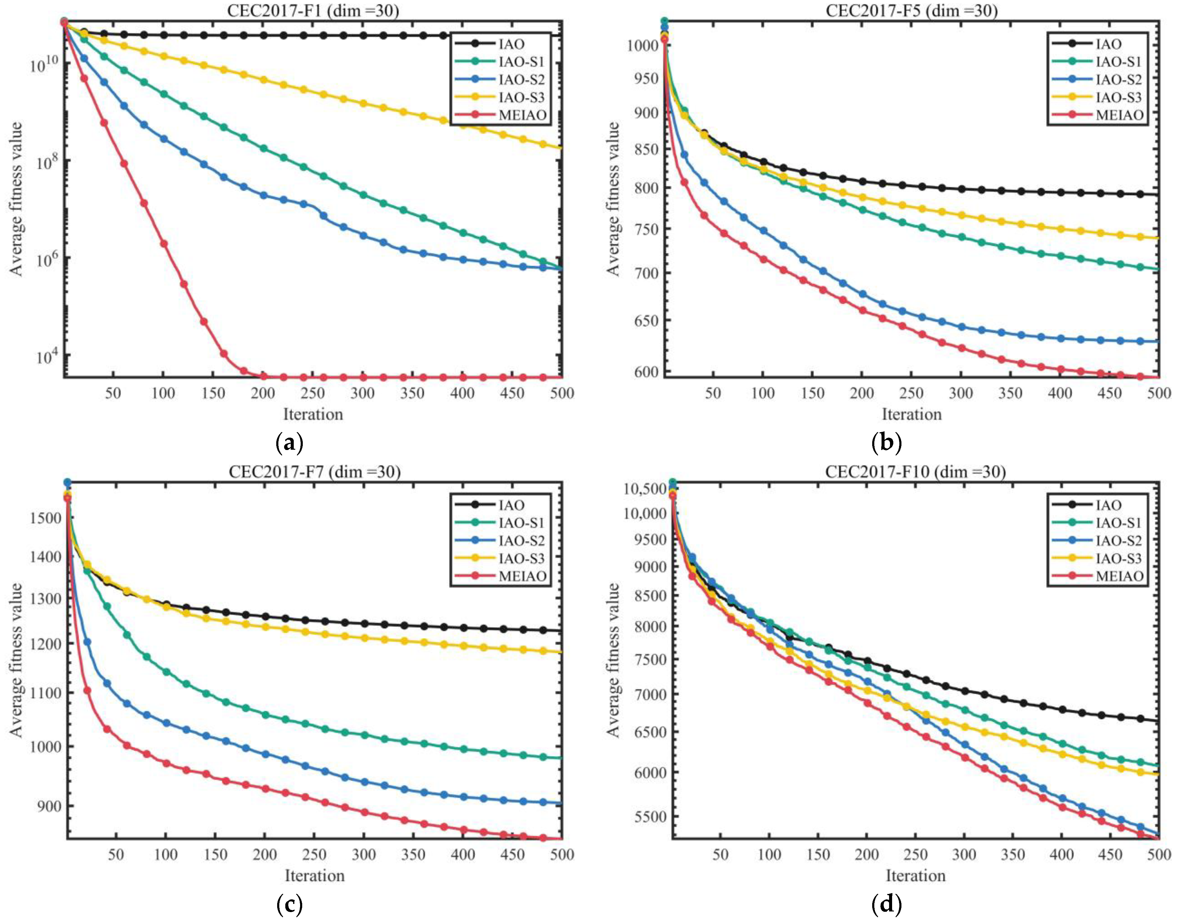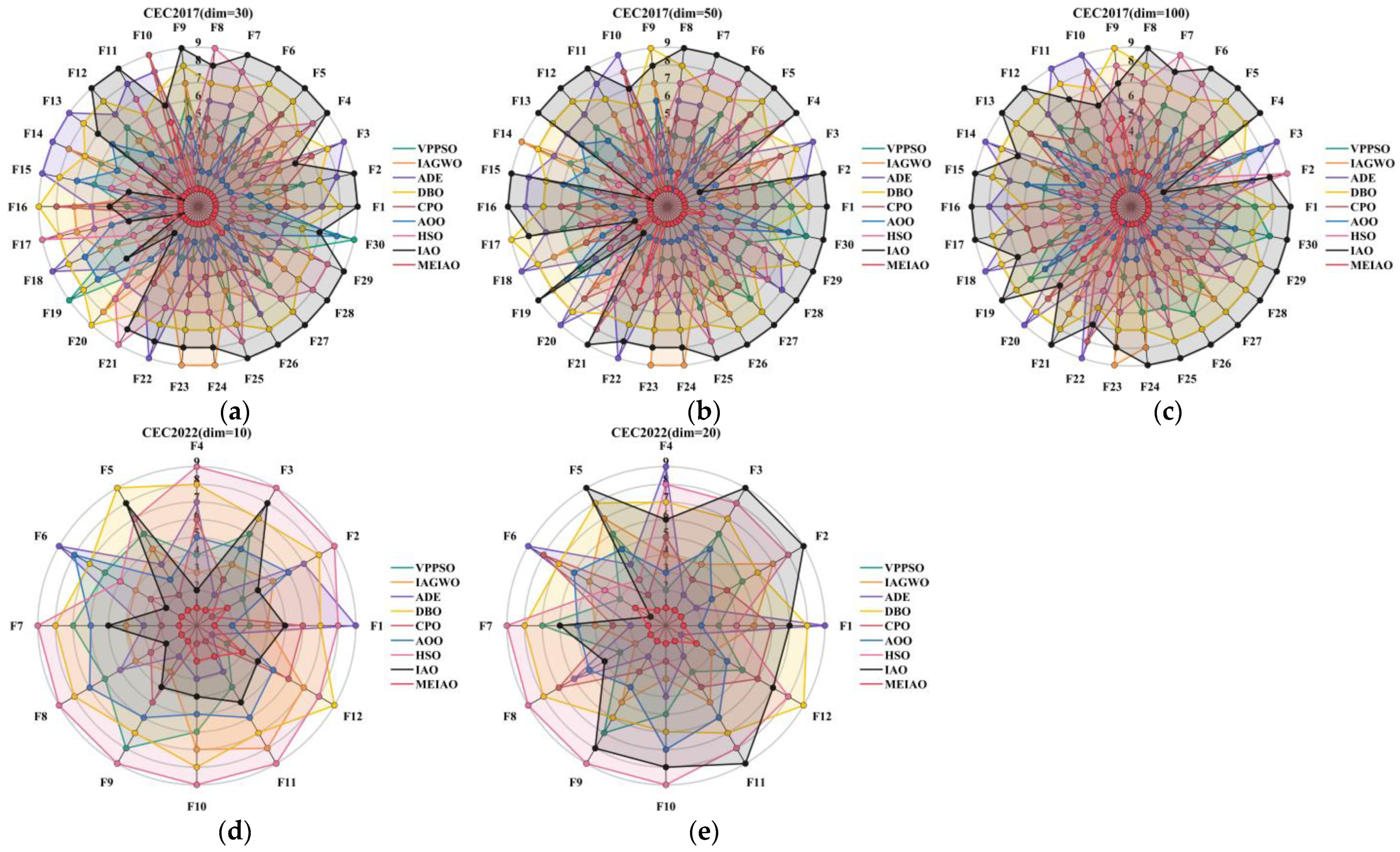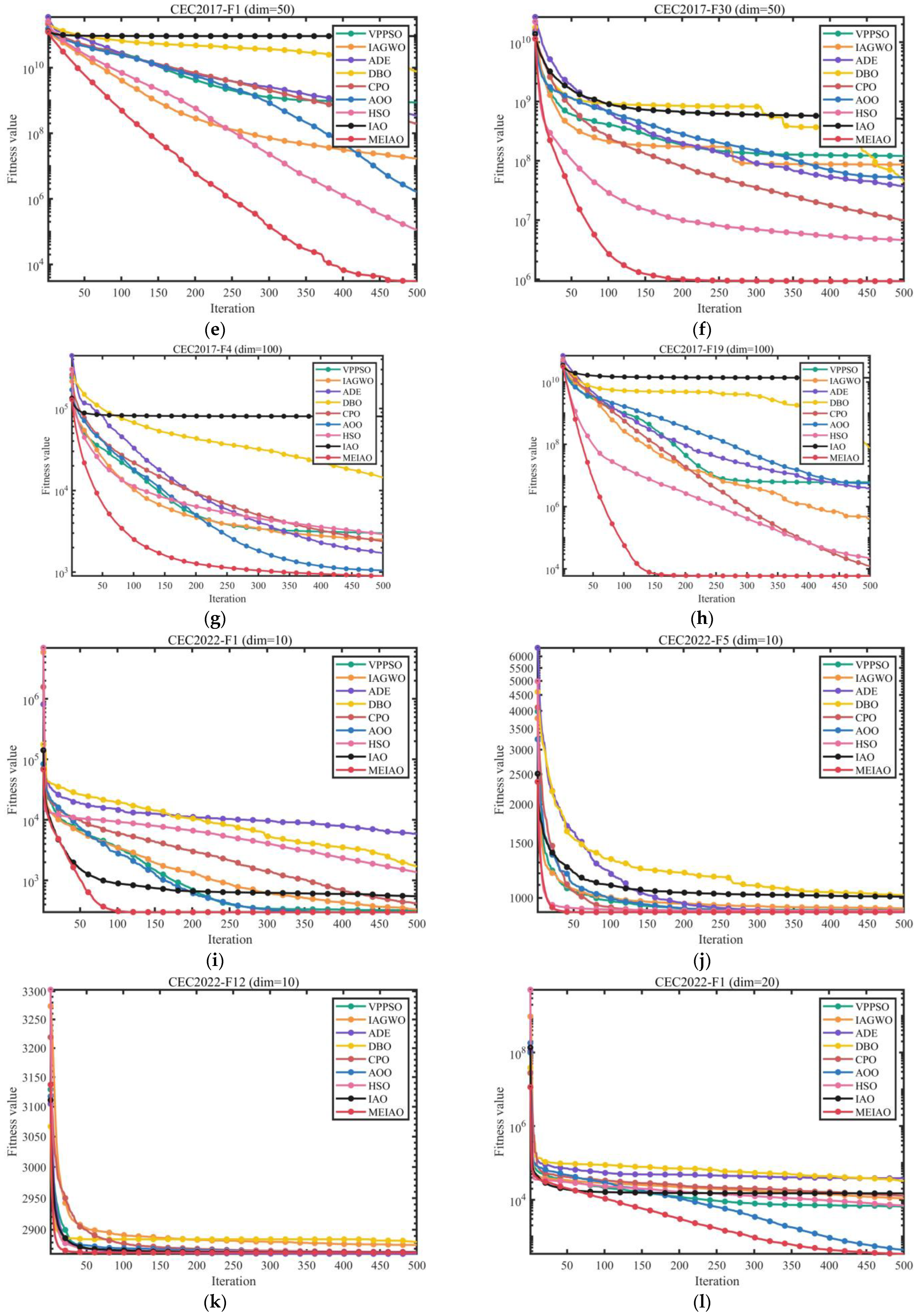- Extensive experiments on the CEC2017 and CEC2022 benchmark suites compare MEIAO with eight mainstream algorithms. Evaluation metrics including mean, standard deviation, Friedman mean rank, and Wilcoxon rank-sum tests demonstrate MEIAO’s superior performance in local exploitation of unimodal functions, global exploration of multimodal functions, and complex adaptation of composite functions.