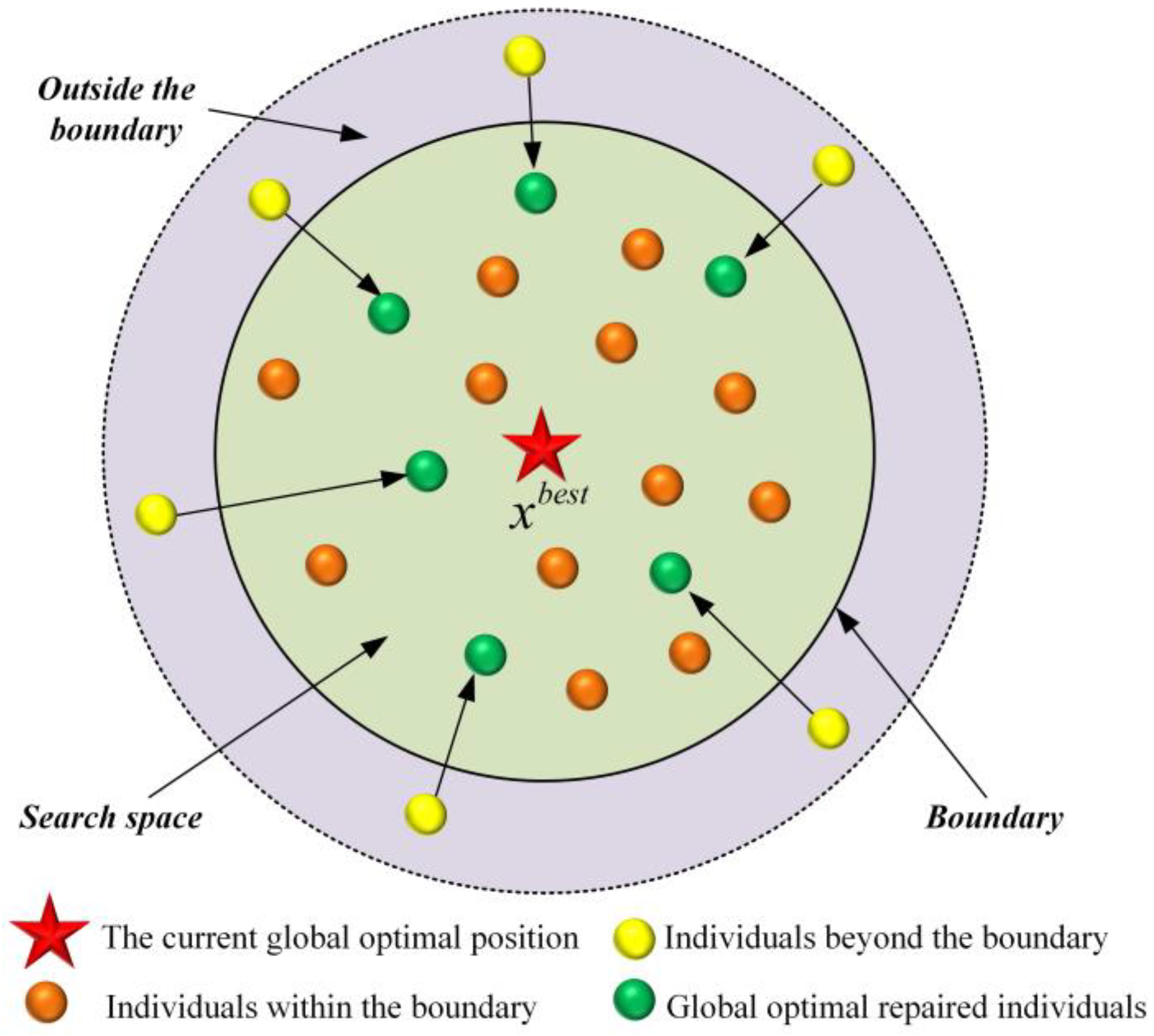 | 1: Initialize Problem Setting (population(N), dim, ub, lb), Max iterations. 2: Initialize the solution’s positions (). 3: while do 4: Calculate the energy factor using Equation (8). 5: Generate a random number between . 6: Generate randomly two integers and between . 7: Generate a candidate population by Equations (8)–(10). 8: for do 9: Calculate the fitness by Equations (2)–(5). 10: Boundary processing by Equation (15). 11: end for 12: for do 13: Calculate the fitness by Equations (6) and (7). 14: Boundary processing by Equation (15). 15: end for 16: Adaptive differential evolution operator by Equations (11)–(14). 17: Boundary processing by Equation (15). 18: end for 19: Update the position of solution and its fitness value. 20: Find the best solution position and fitness value so far. 21: end while 22: Return the best solution. |