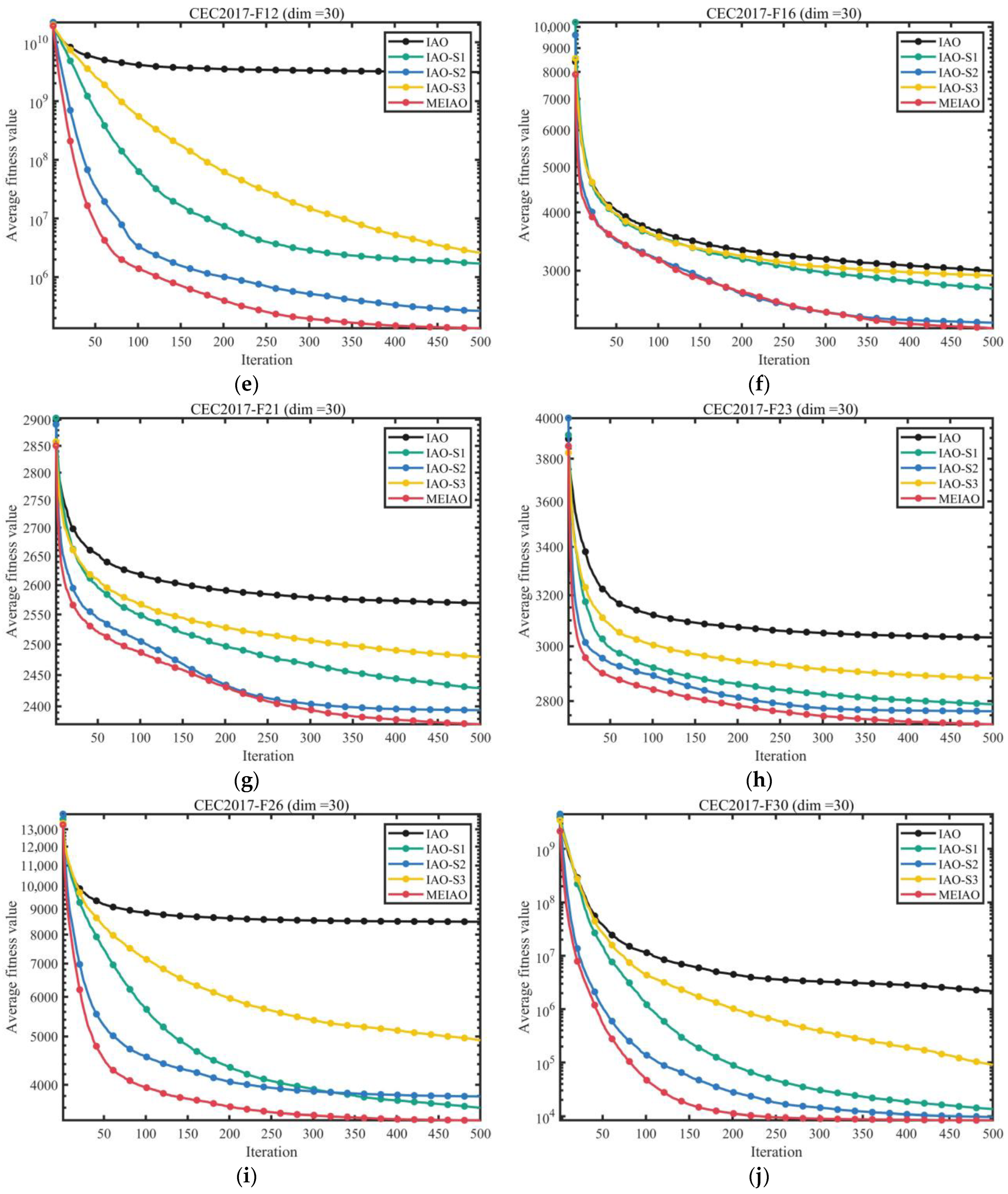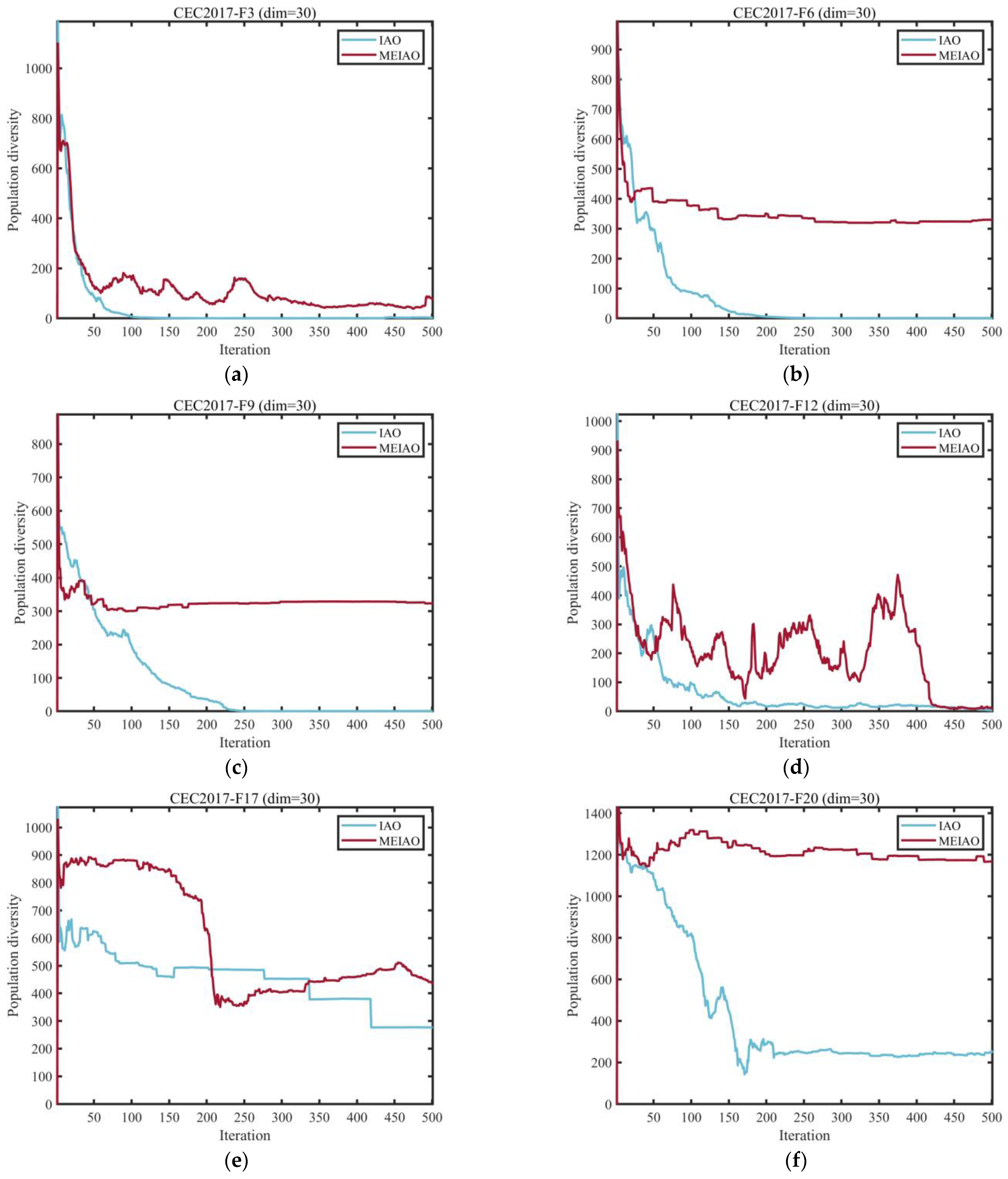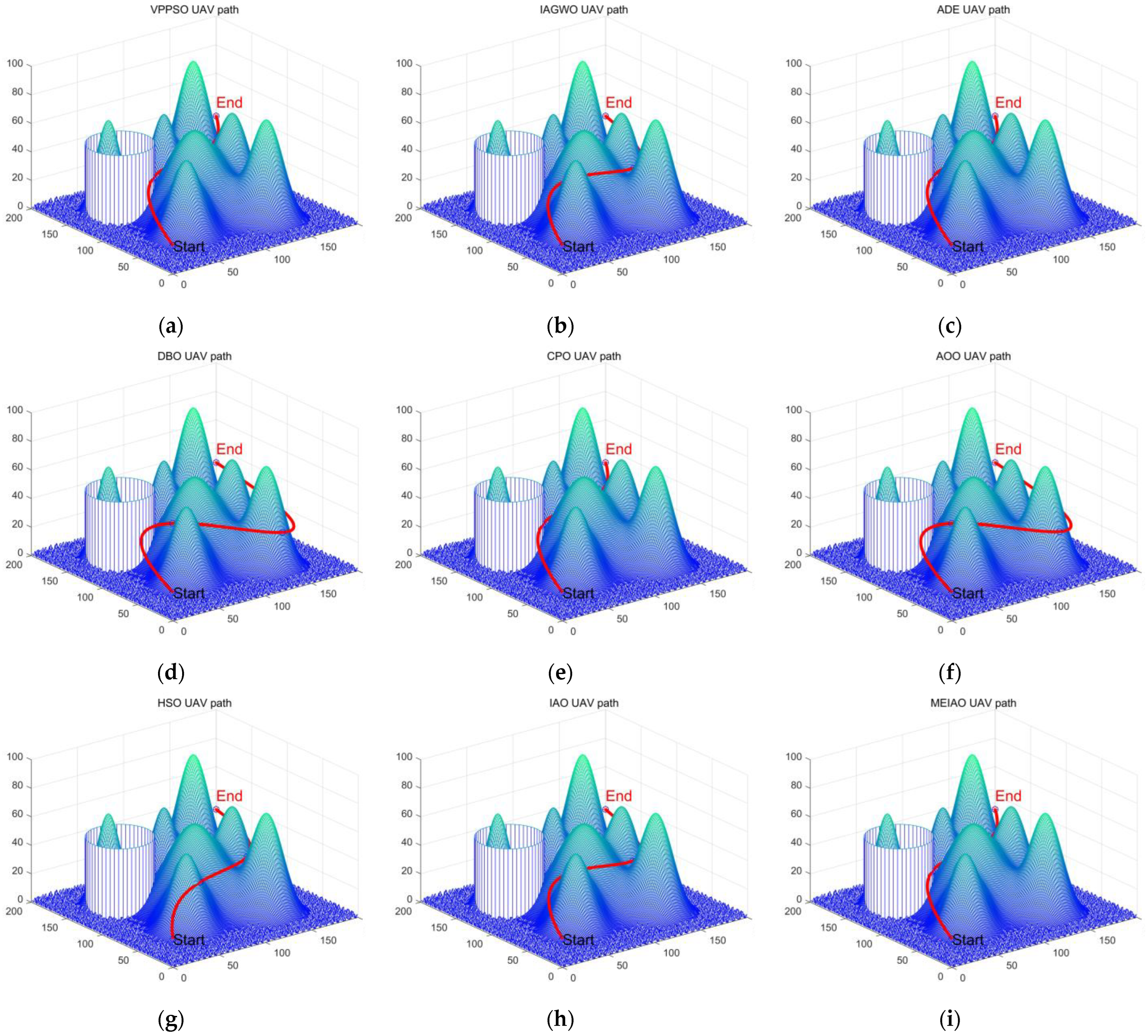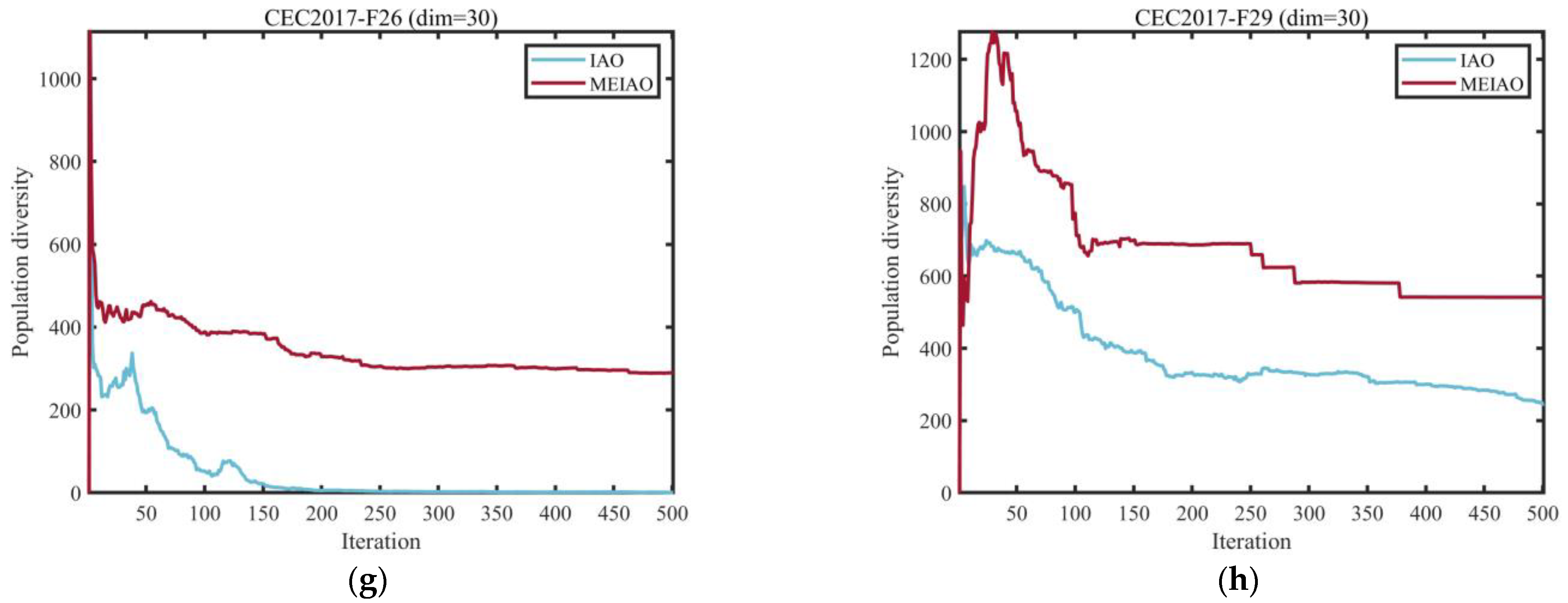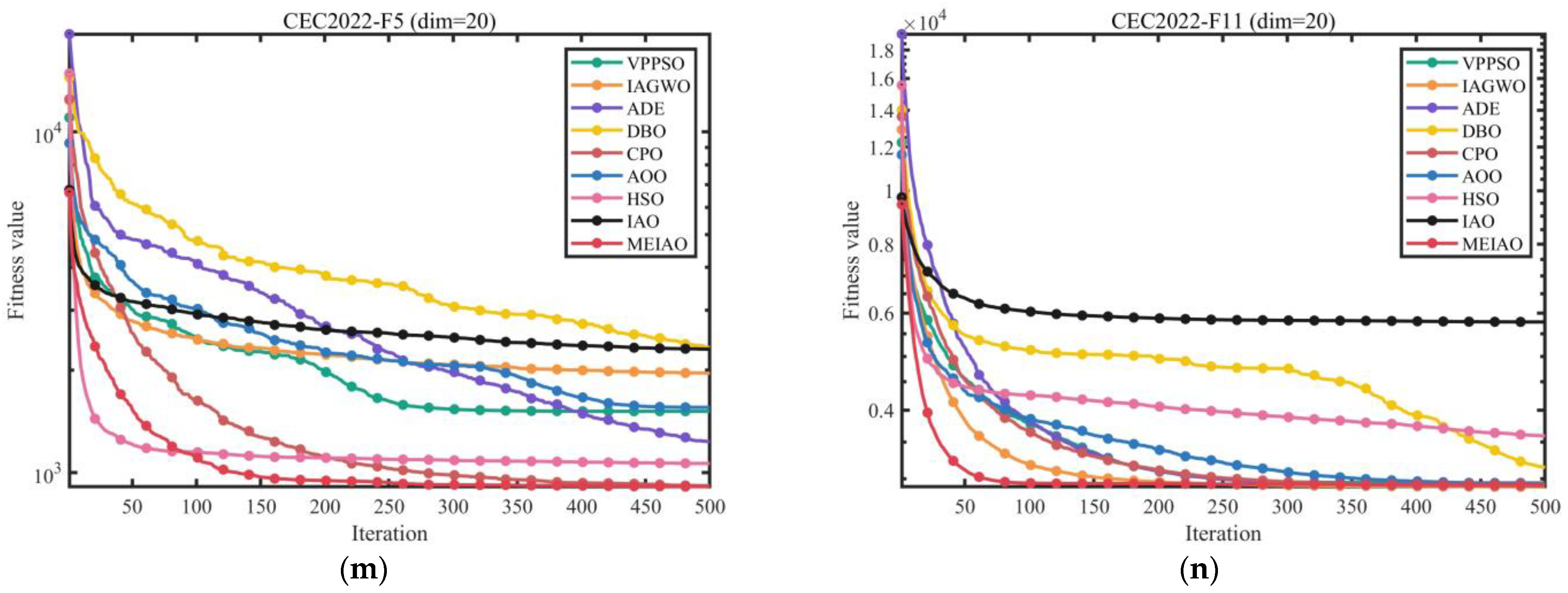 - The integration of Levy Flight-based information collection, adaptive differential evolution, and globally guided boundary handling into the original IAO results in the proposed MEIAO, which comprehensively enhances algorithm performance in high-dimensional, multimodal, and complex-constrained scenarios.
