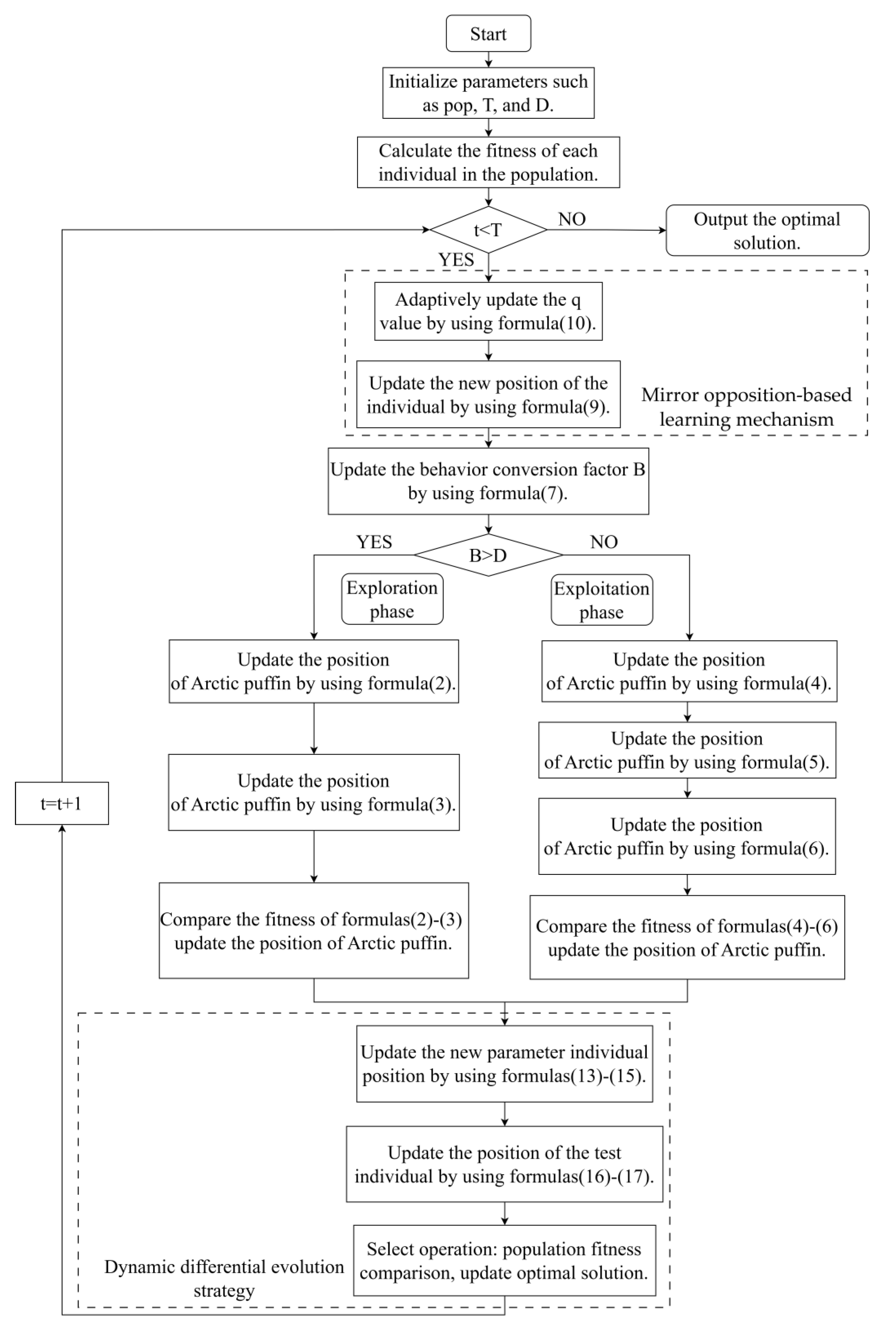 28] shares its conceptual foundation with genetic algorithms. Both employ random initialization to generate a starting population, utilize fitness values to guide selection, and proceed iteratively through mutation, crossover, and selection operations. However, the Arctic Puffin Optimization (APO) algorithm tends to converge near local optima in the later stages of optimization, increasing the risk of premature convergence. To mitigate this limitation, a dynamic differential evolution strategy is incorporated, which introduces an adaptive scaling factor. The specific procedure is outlined below.