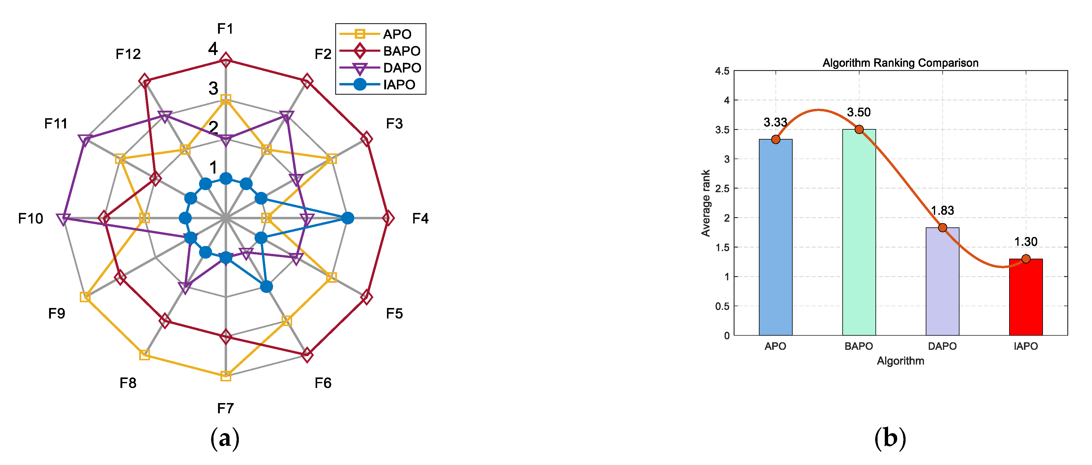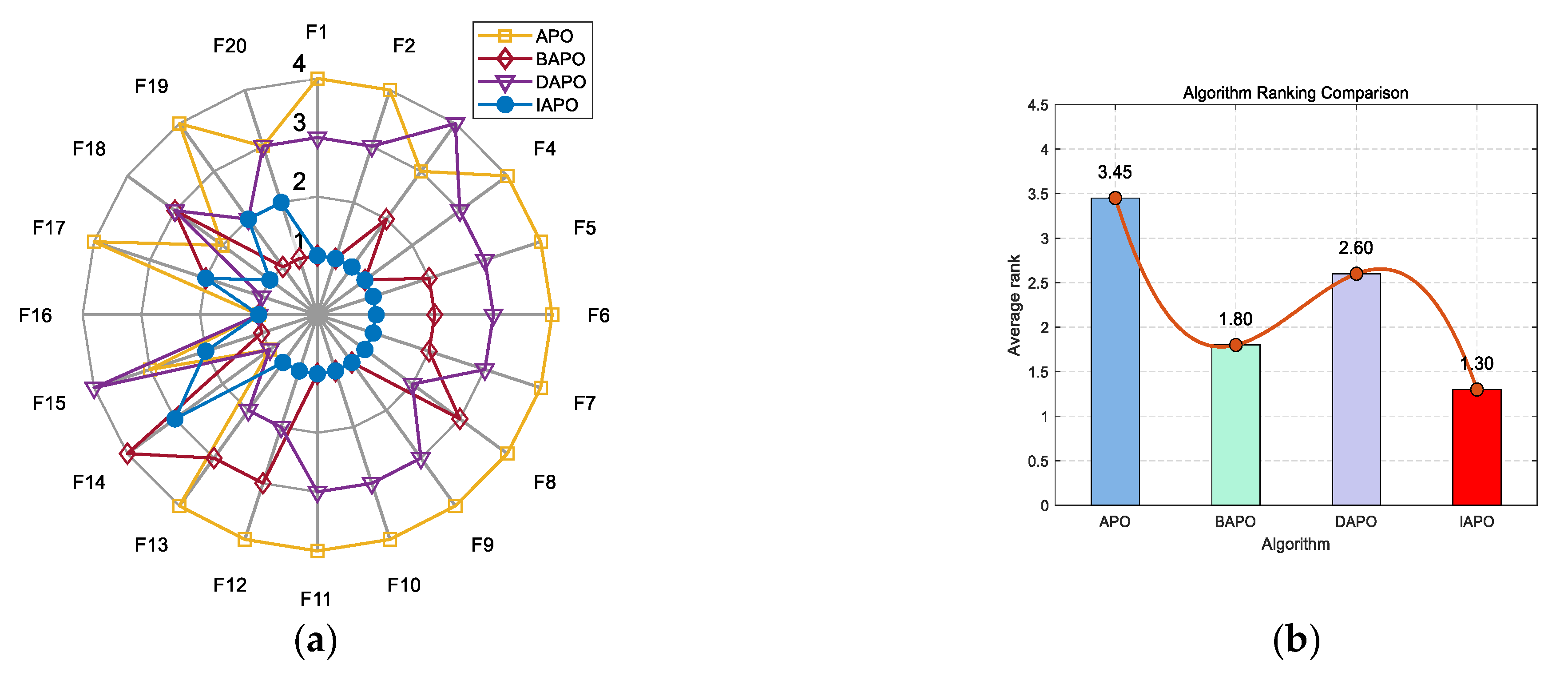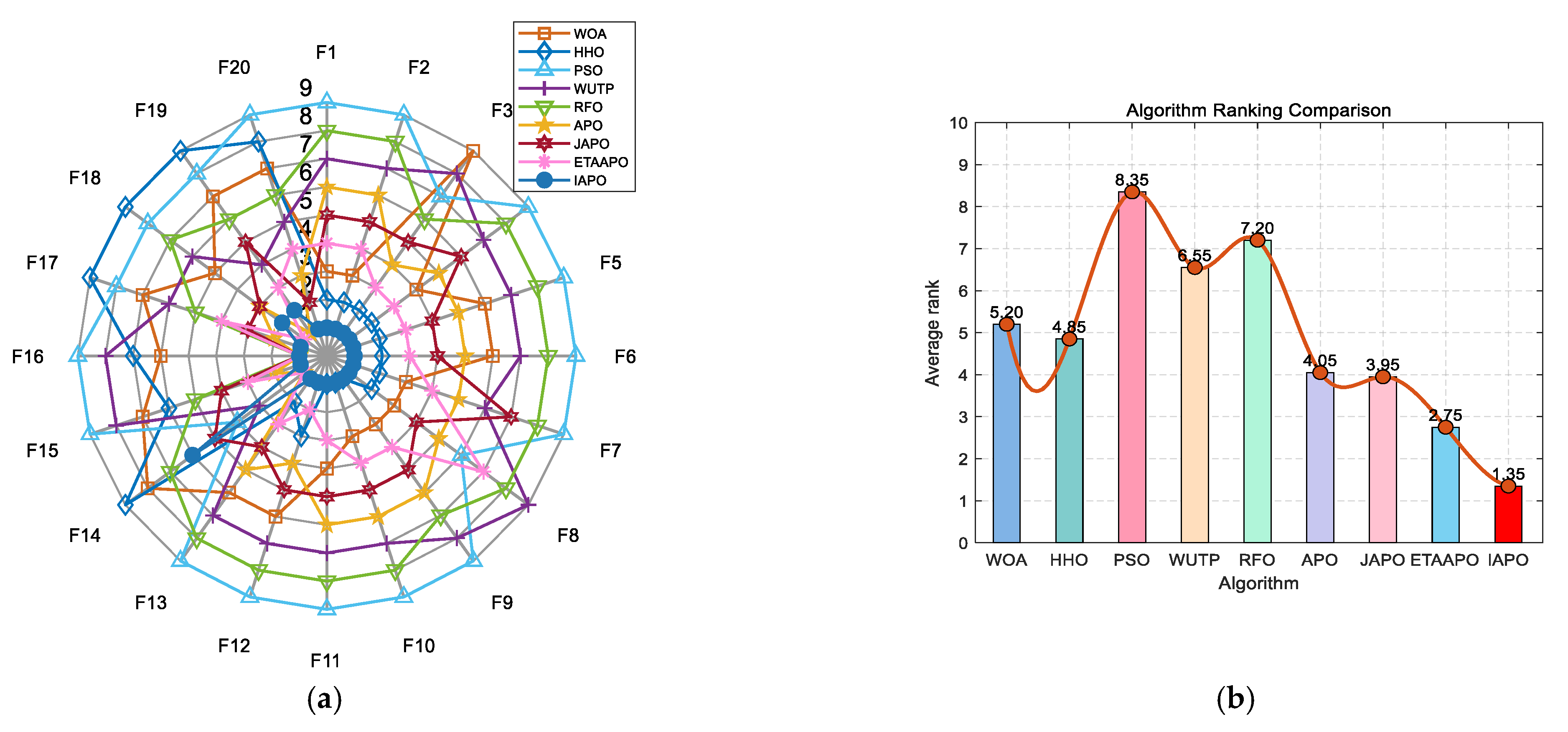 Figure 7 presents a radar chart and a bar chart summarizing the ranking of each algorithm across the 20 benchmark functions. In the radar chart, IAPO (blue circles) encloses the smallest area and is consistently positioned closer to the center—indicating superior and more stable performance. Similarly, the bar chart confirms that IAPO achieves the highest overall ranking, underscoring its effectiveness compared to the other algorithms.