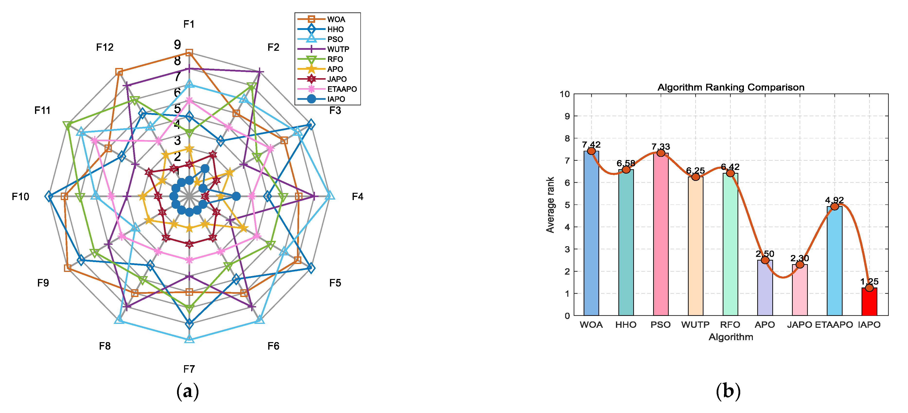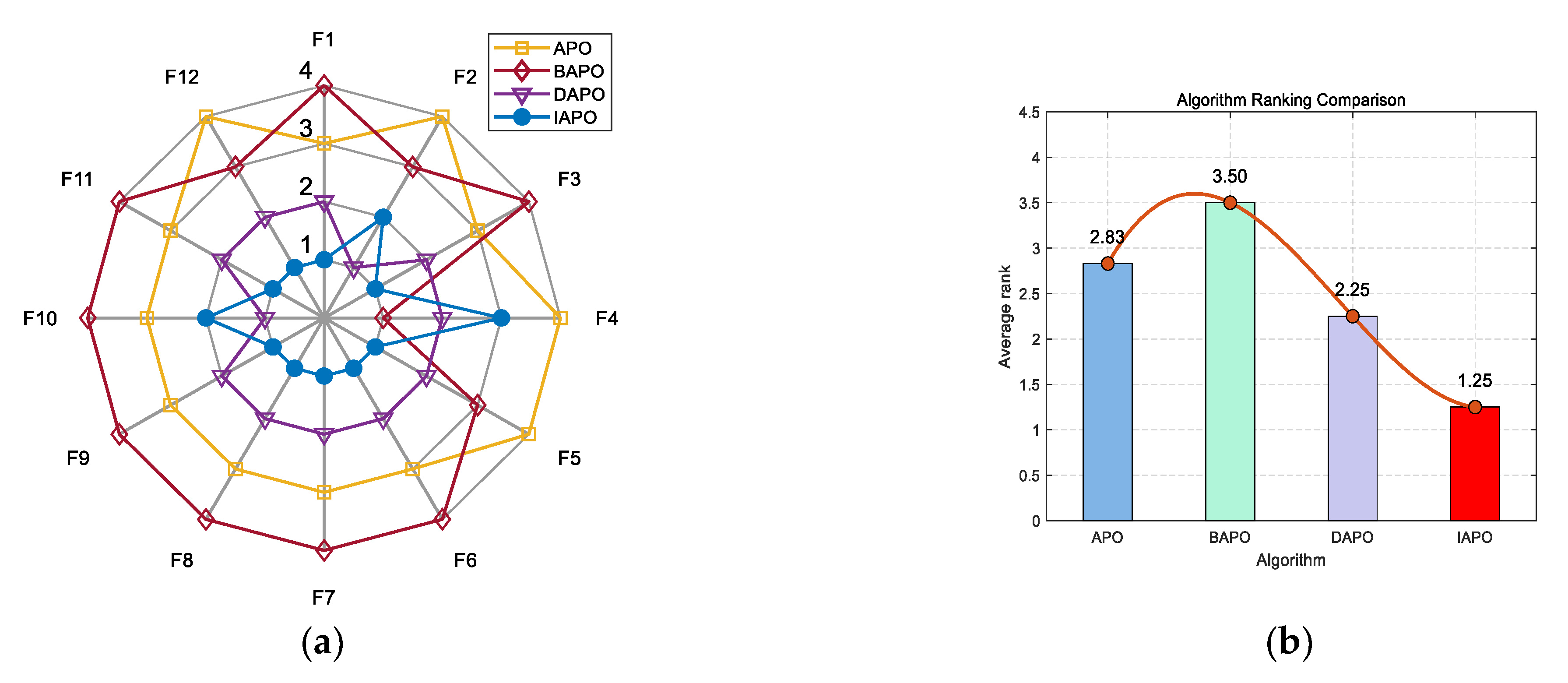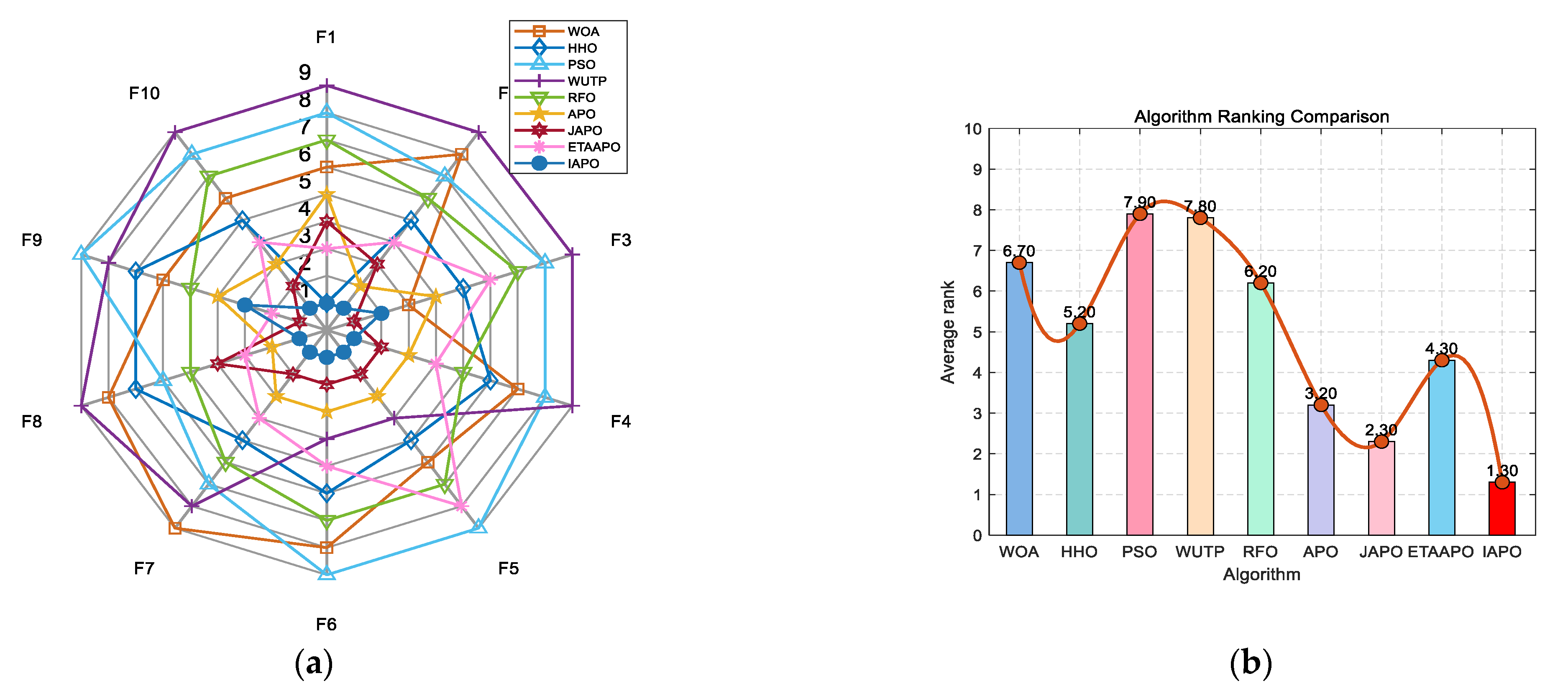 Figure 7 presents a radar chart and a bar chart summarizing the ranking of each algorithm across the 20 benchmark functions. In the radar chart, IAPO (blue circles) encloses the smallest area and is consistently positioned closer to the center—indicating superior and more stable performance. Similarly, the bar chart confirms that IAPO achieves the highest overall ranking, underscoring its effectiveness compared to the other algorithms.