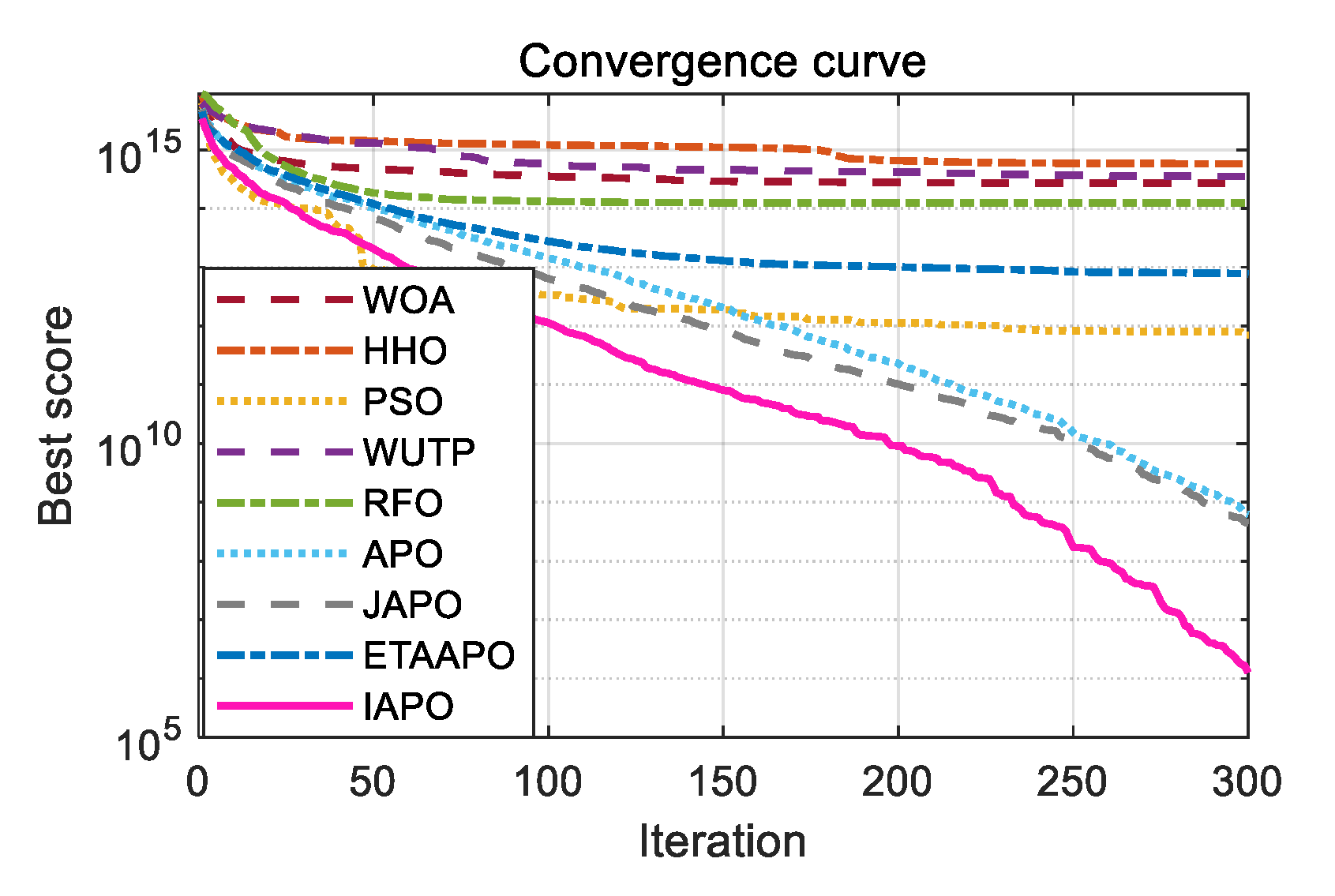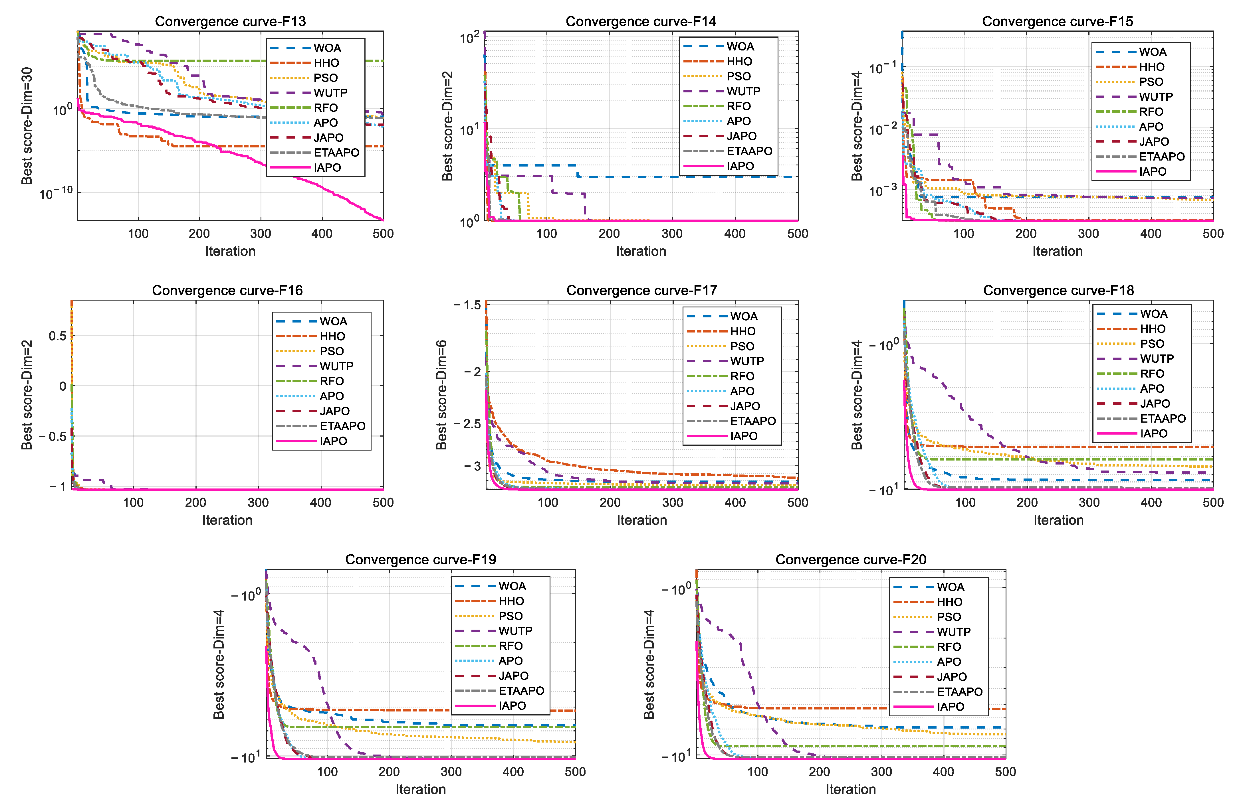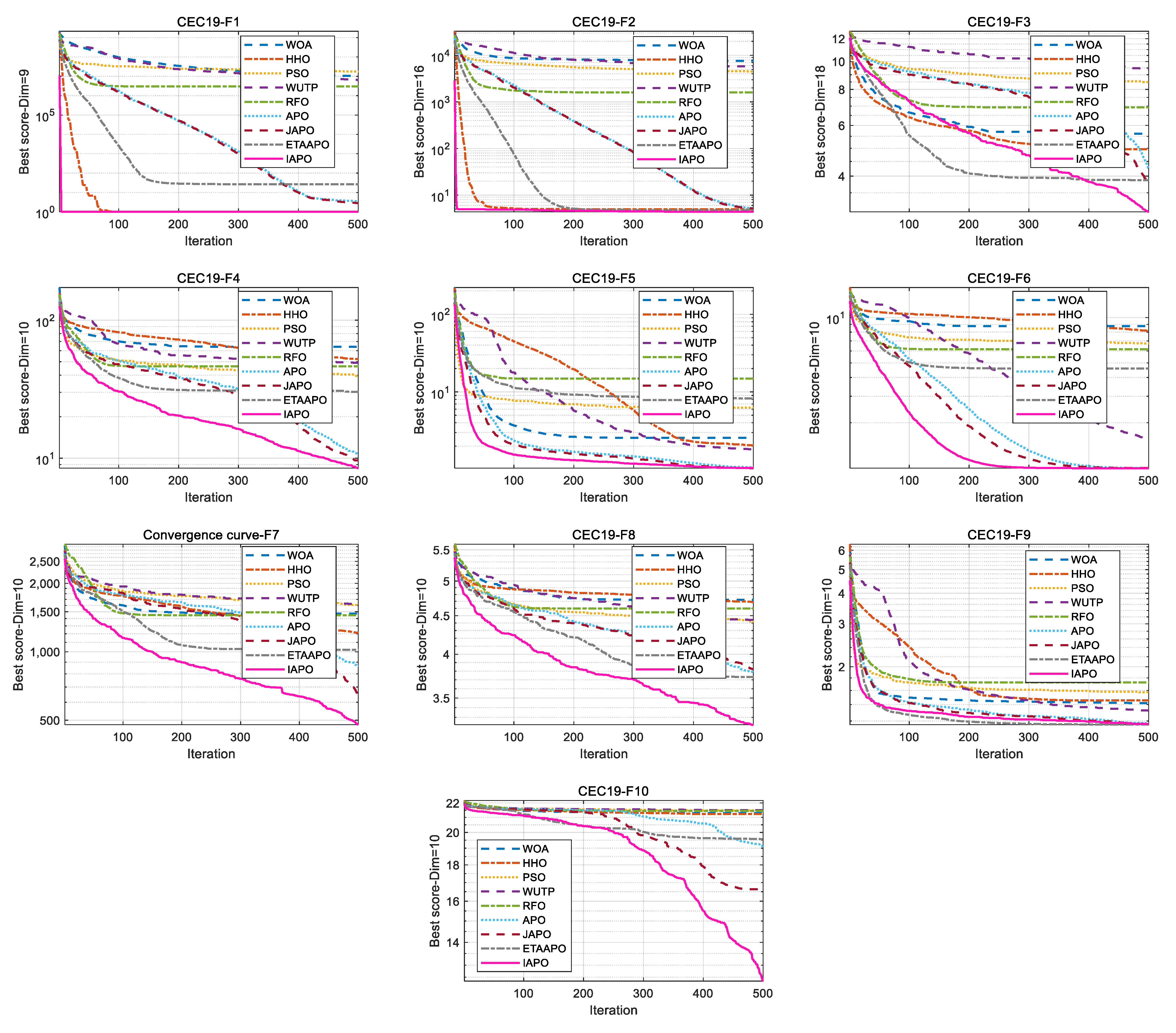 Section 4.2, the proposed IAPO algorithm was compared with WOA, HHO, PSO, WUTP, RFO, APO, JAPO, and ETAAPO. The corresponding results of the CEC 2019 test set are detailed in