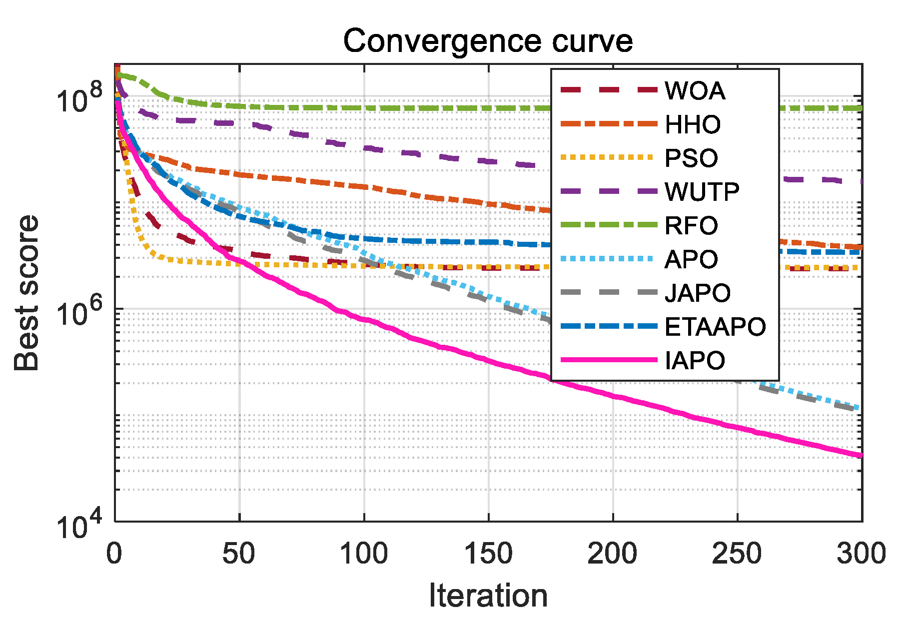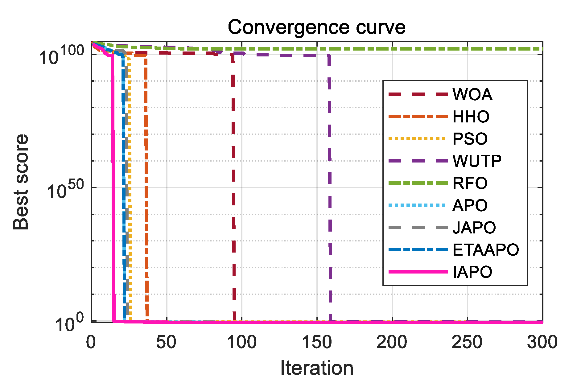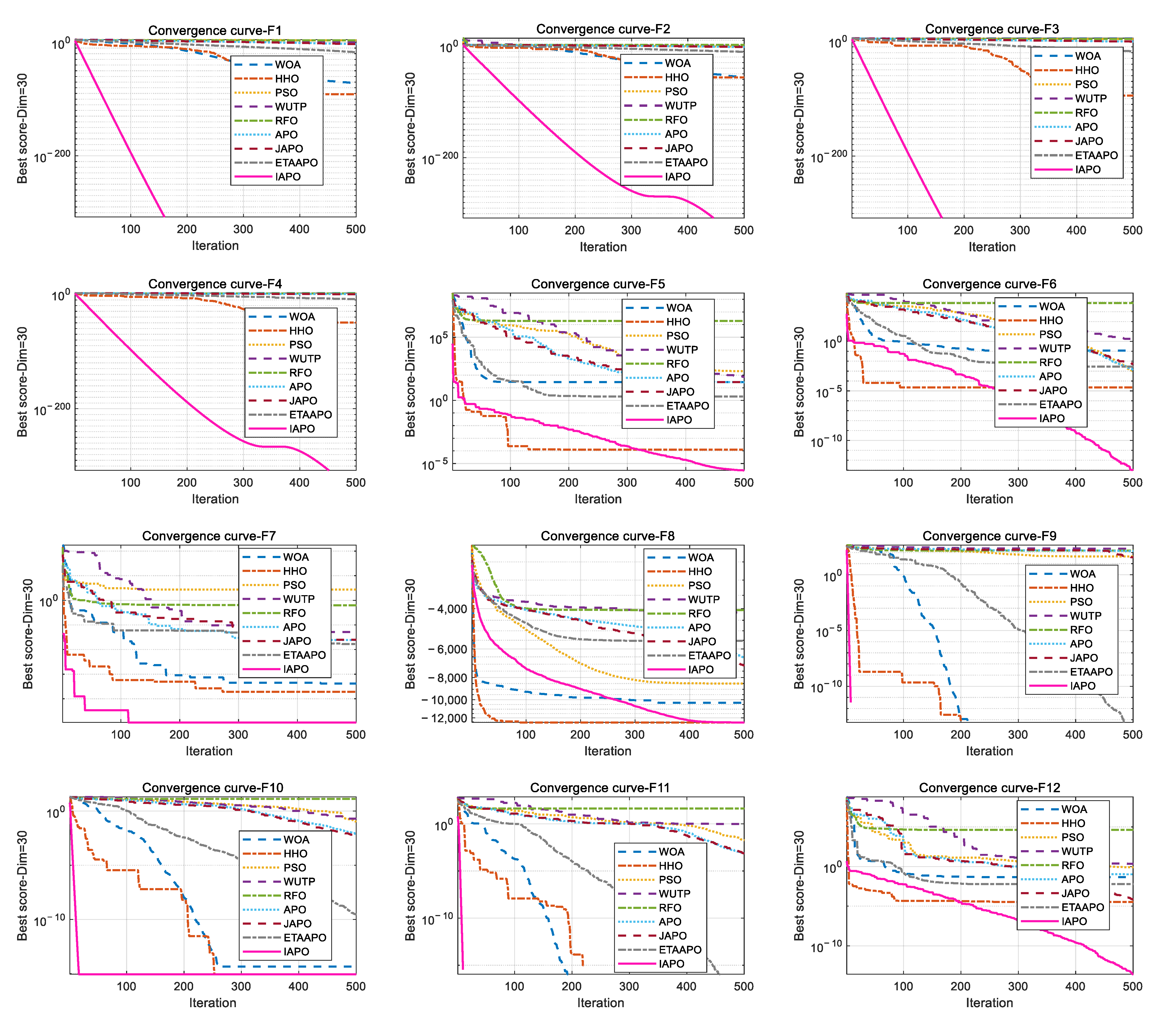 Section 4.2, the proposed IAPO algorithm was compared with WOA, HHO, PSO, WUTP, RFO, APO, JAPO, and ETAAPO. The corresponding results of the CEC 2019 test set are detailed in