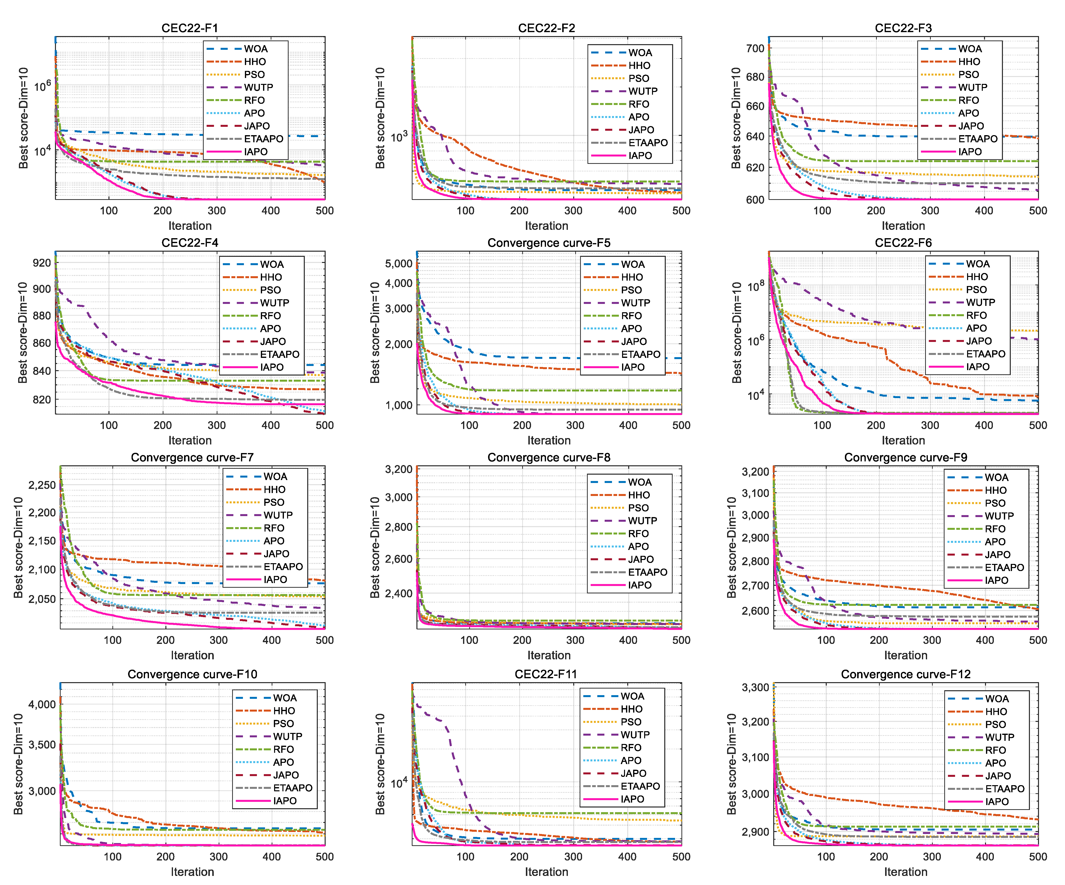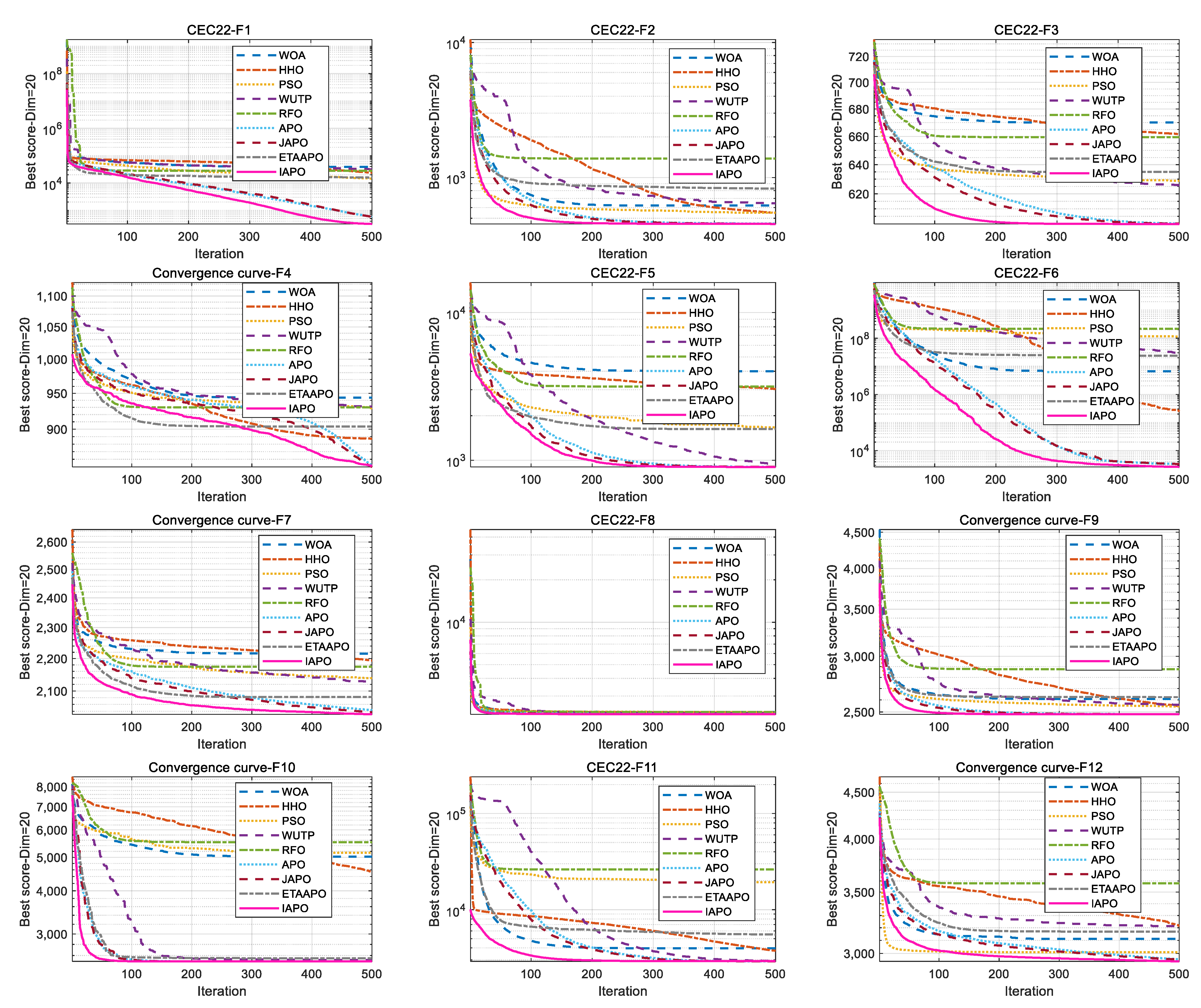 Table 7), IAPO ranked first on 11 functions, and second on F4, closely following JAPO. Overall, IAPO exhibited superior performance on 87.5% of the functions in the CEC 2022 test set.