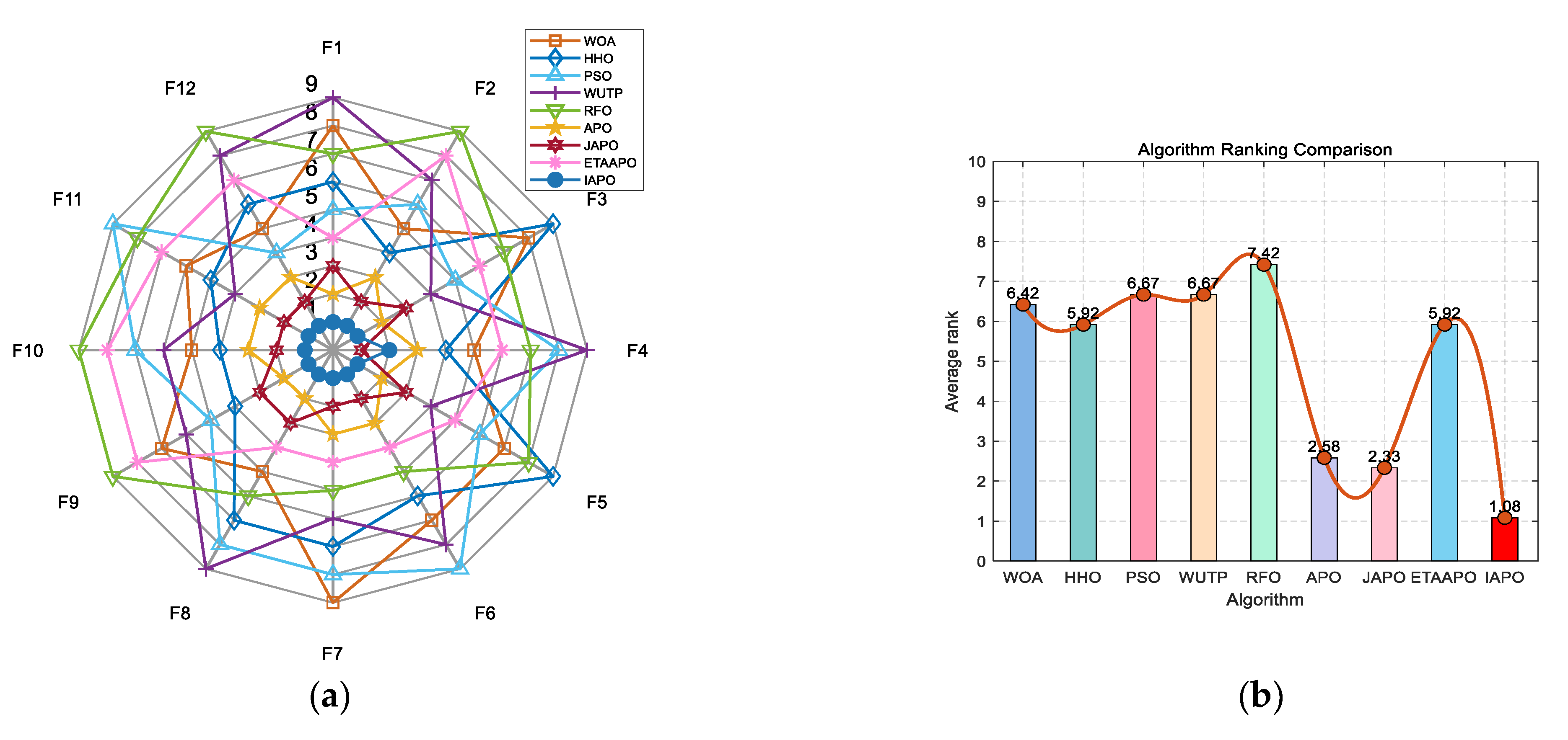To further validate the overall performance ranking of IAPO against the comparison algorithms, the non-parametric Friedman test was conducted. For each test function, the algorithms were ranked based on their optimization results (with Rank 1 assigned to the best performer). If multiple algorithms achieved identical results, they were assigned an average rank. The test was implemented in MATLAB 2022a using the friedman(data) function. The Friedman test compares the average ranks of all algorithms across all functions, where a lower average rank indicates superior overall optimization performance. The calculation of the average rank is shown in Equation (18).