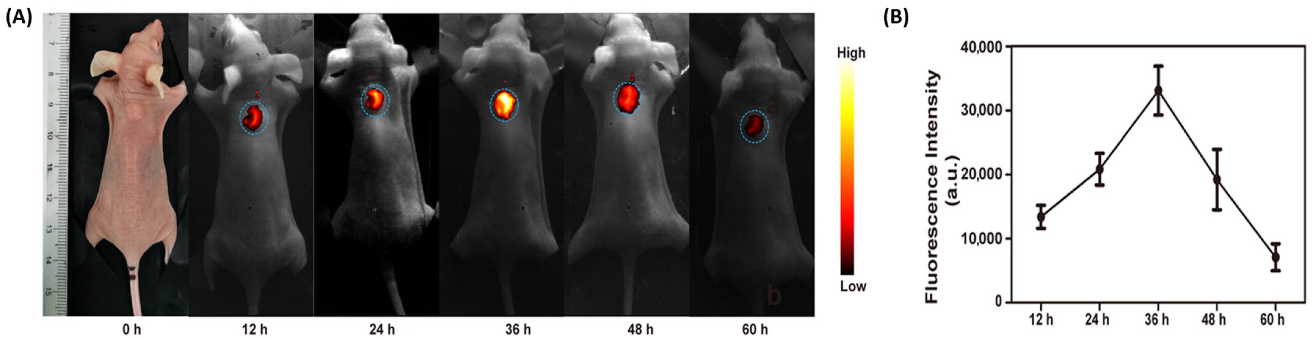 Figure 1. (A) NIR-II fluorescence imaging of subcutaneous tumors over a period of 60 h after injecting the NPs prepared by Pu et al., 2023 [24]. (B) Maximum intensity was observed after 36 h. So, the NPs should be injected 36 h before surgery for the best visualization. Reproduced from Pu et al., 2023, used under a Creative Commons CC-BY-NC-ND 4.0 license [24].