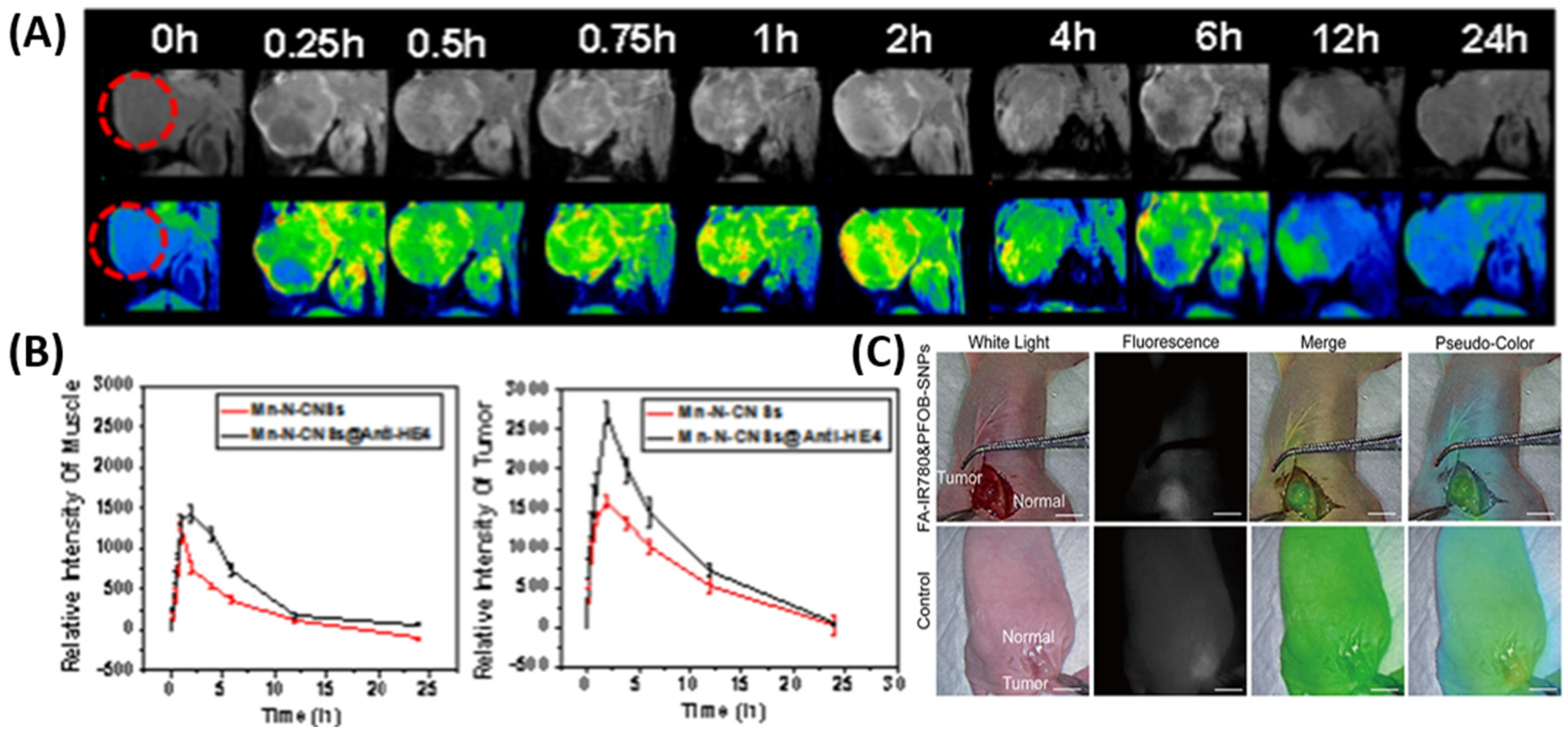 Figure 2. (A) (Top) T1-weighted MRI and (bottom) corresponding pseudo-color fluorescence images after injecting the bi-modal imaging agent containing anti-HE4 antibody. The red circle indicates the tumor. (B) Intensity of signal in the muscles (left) and in the tumors (right). Reproduced from Han et al., 2020, used under a Creative Commons CC BY 4.0 license [36]. (C) Fluorescence imaging at 72 h post-intraperitoneal injection. The bar indicates 1 cm. Reproduced from Song et al., 2022, used under a Creative Commons CC BY-NC 3.0 license [26].