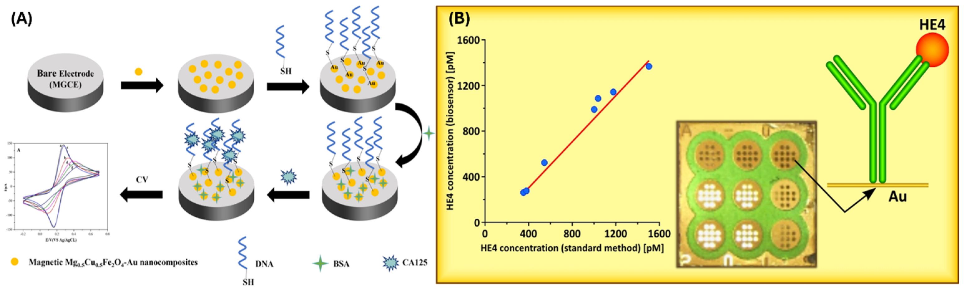 Figure 3. Schematics of the fabrication methods of electrochemical sensors for (A) CA-125 (reproduced from Yue et al., 2023, used under a Creative Commons BY-NC-SA 4.0 license) [49] and (B) HE4 (reproduced from Szymanska et al., 2021, used under a Creative Commons CC BY 4.0 license) [59].