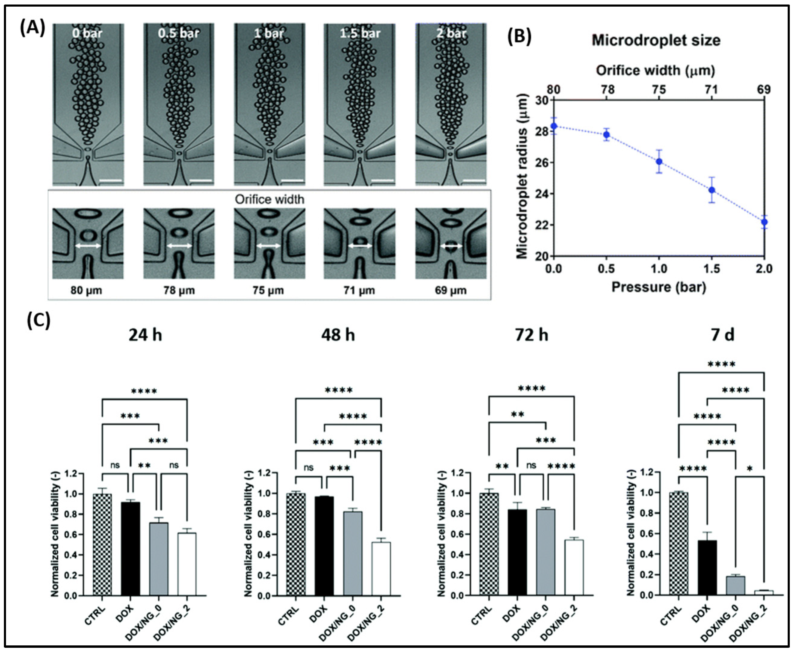 Figure 5. (A) Microfluidic nanogel production at different orifice widths and actuation pressures. (B) The largest nanogel droplet was formed at 0 bar (NG_0), and the smallest ones were formed at 2 bar (NG_2). (C) Cytotoxic effect on OVCA433 cells exerted by the nanogels over a period of 7 days. Cell viability levels (from MTT assay) standardized against internal controls are used to express the treatment effect. The mean ± SD of three separate experiments is the result. One-way ANOVA was used for statistical analysis (ns = not significant, * p < 0.05, ** p < 0.01, *** p < 0.001, and **** p < 0.0001). Reproduced from Giannitelli et al., 2022, used under a Creative Commons CC BY-NC 3.0 license [64].