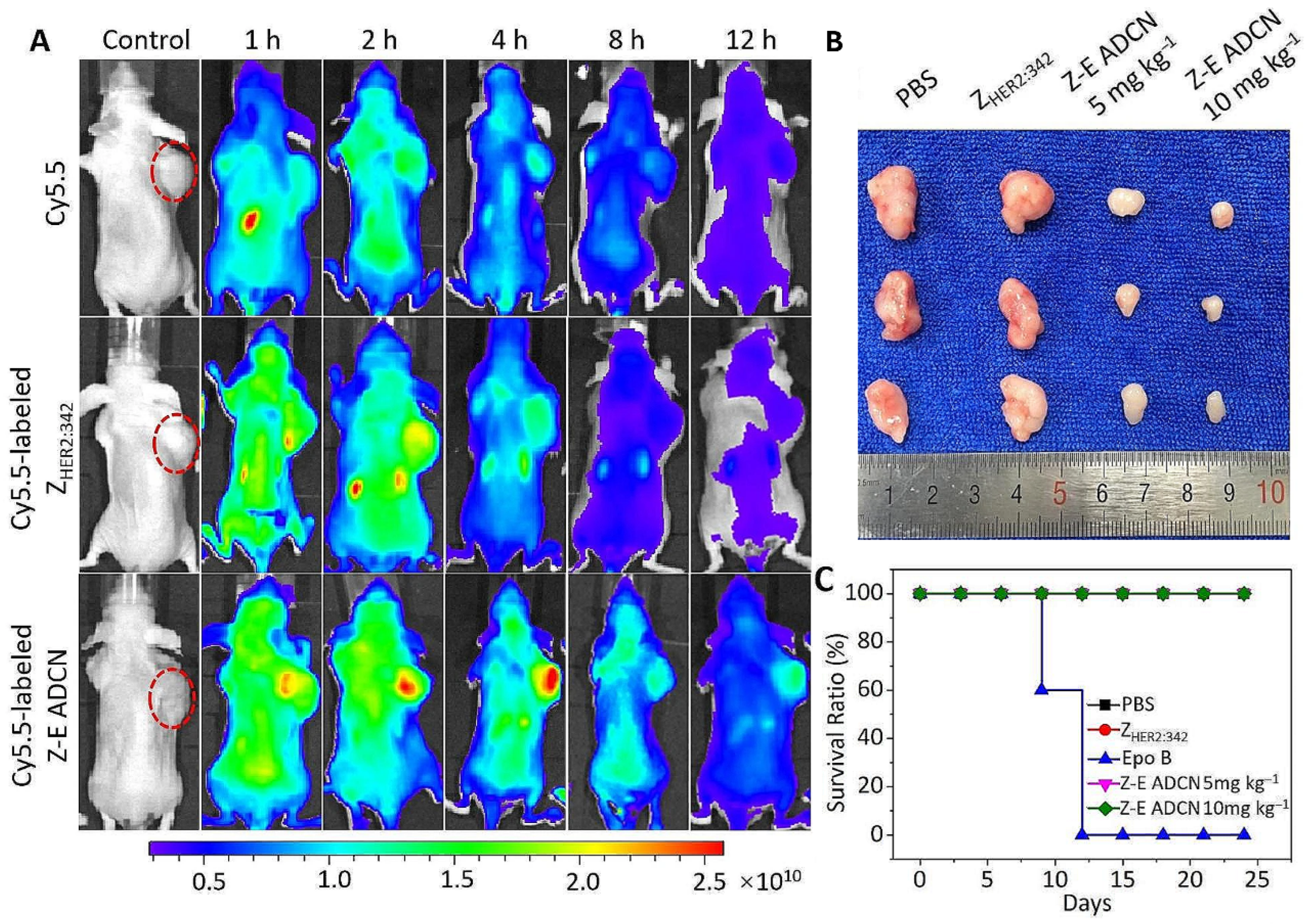 Figure 7. (A) Biodistribution of free Cy5.5 dye, Cy5.5-labeled ZHER2:342, and Cy5.5-labeled Z-E ADCN, (B) tumor volumes after 24 days of treatment, and (C) survival curves of different groups of tumor-bearing mice. Reproduced from Xia et al., 2024, used under a Creative Commons CC BY-NC-ND 4.0 license [92].