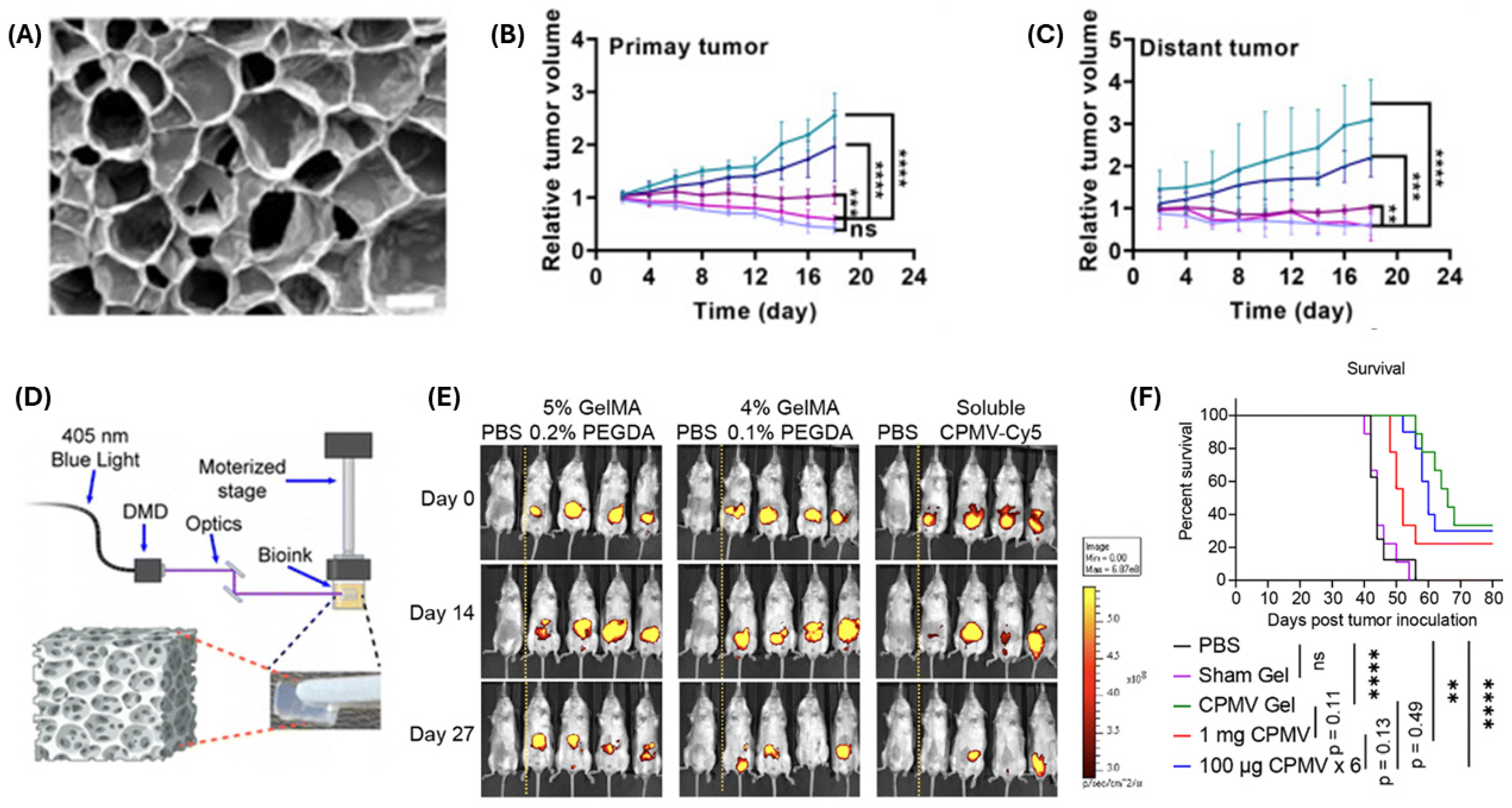 Figure 9. (A) SEM image of the nanogel prepared by Li et al., 2024 [115]. The white scale bar corresponds to 50 μm. (B) Relative volumes of tumors at the primary sites and (C) distant sites (representative of metastasis). The mean ± SD of five separate experiments is the result. One-way ANOVA or t-test was used for statistical analysis (ns = not significant, ** p < 0.01, *** p < 0.001, and **** p < 0.0001. Reproduced from Li et al., 2024, used under a Creative Commons CC BY-NC-ND 4.0 license [115]. (D) Schematic showing the CPMV implant bioprinting process, (E) fluorescent CPMV-Cy5 implants imaged on days 0, 14, and 27, (F) survival rates of different treatment groups. Reproduced from Zhao et al., 2024, used under a Creative Commons CC BY-NC 3.0 license [116].