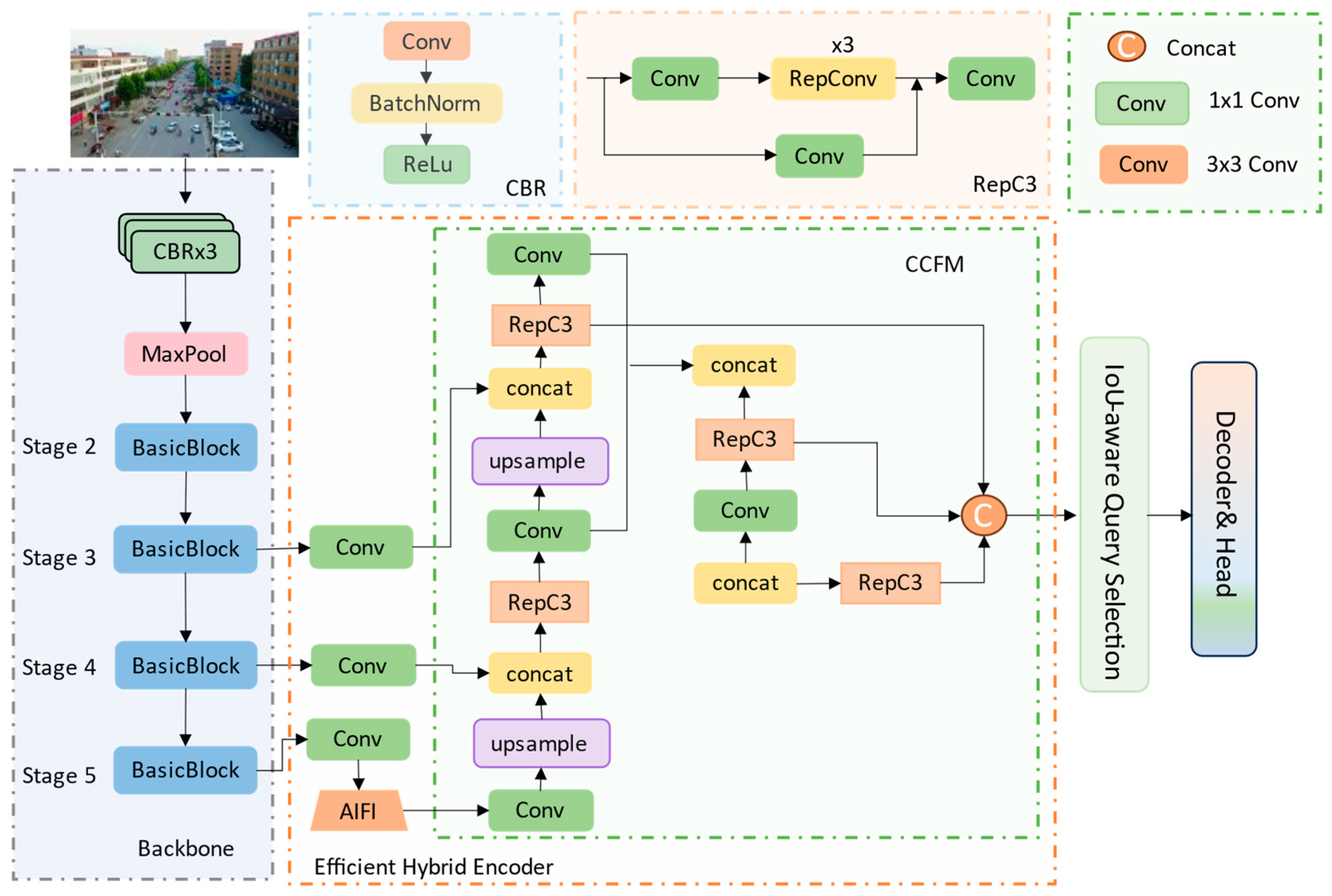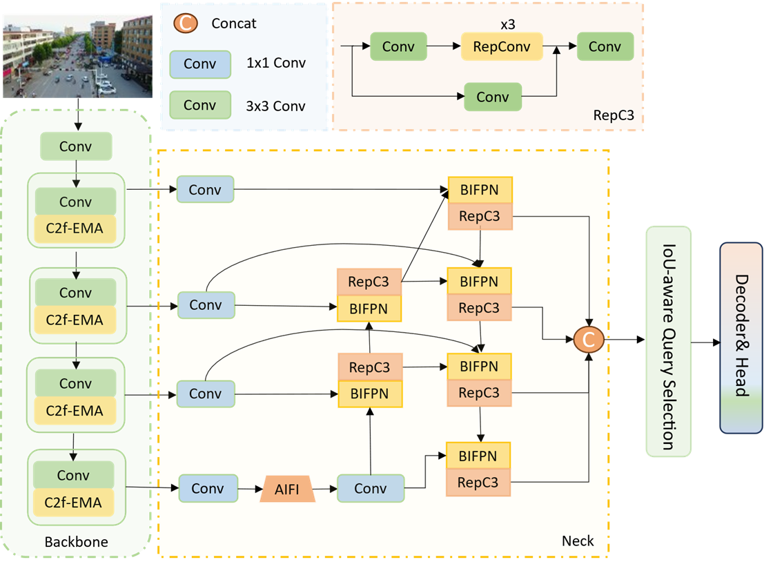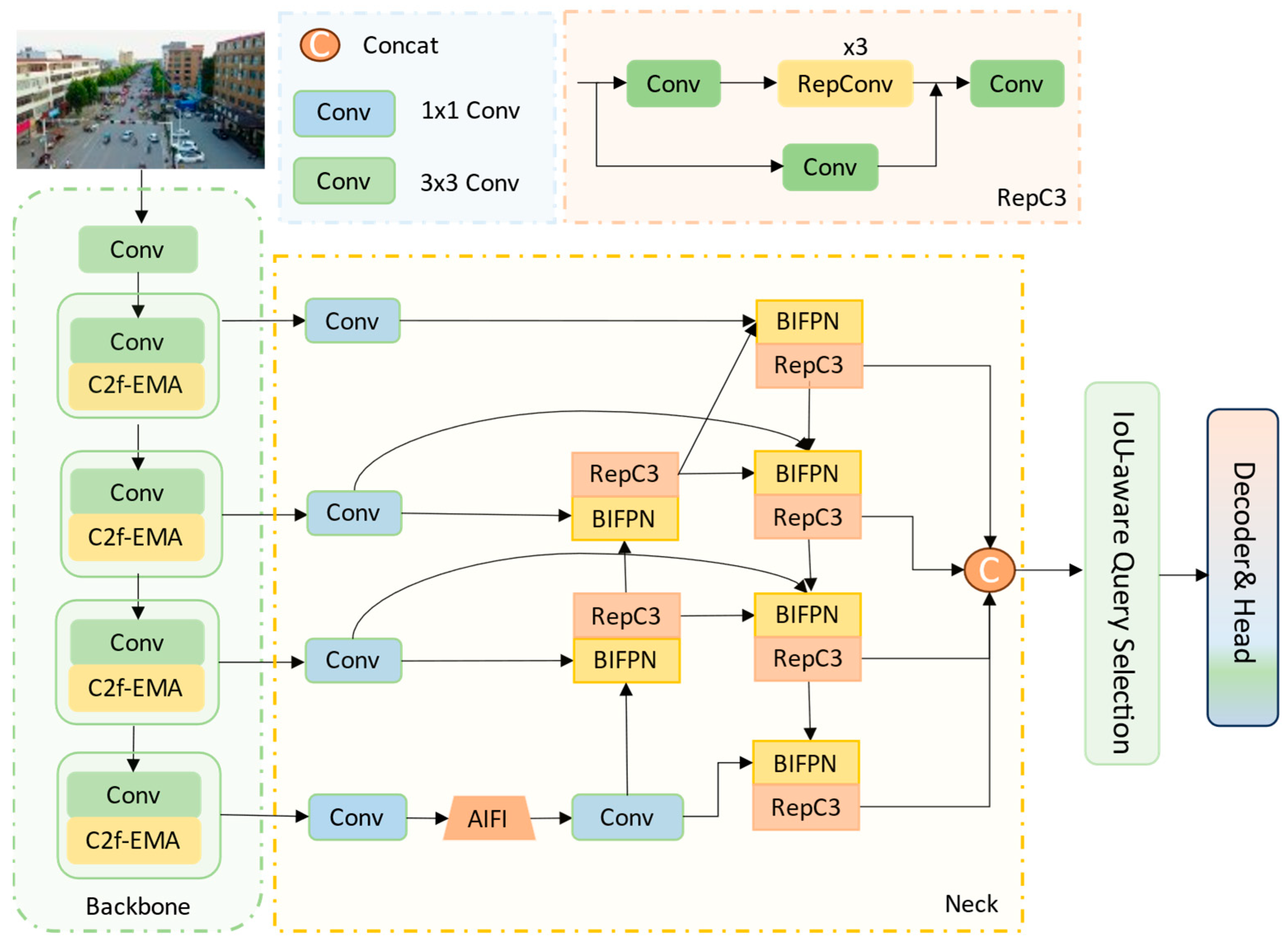 Figure 2, the proposed EABI-DETR network comprises three main components: Backbone, Neck, and Decoder & Head. Compared with RT-DETR (