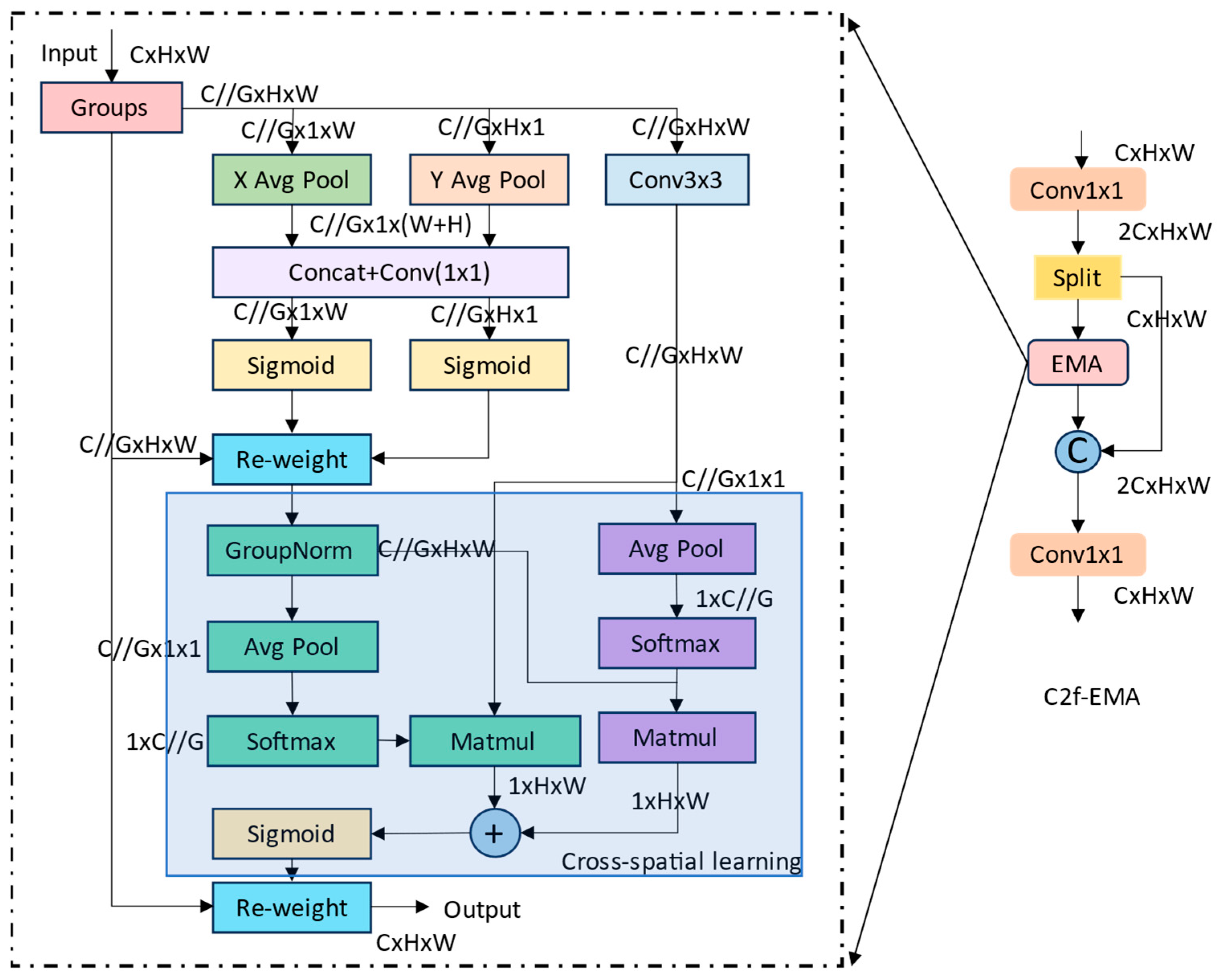 To enhance small-object perception and model efficiency, this study adopts the lightweight design philosophy of the YOLO family and introduces the C2f module in the feature extraction stage. Nevertheless, features extracted solely through convolution operations remain single-scale and lack sufficient saliency. To address this limitation, an Efficient Multi-scale Attention (EMA) mechanism is embedded within the C2f module, forming a new backbone structure termed C2f-EMA. This design achieves multi-scale feature enhancement and cross-spatial dependency modeling without increasing computational cost.