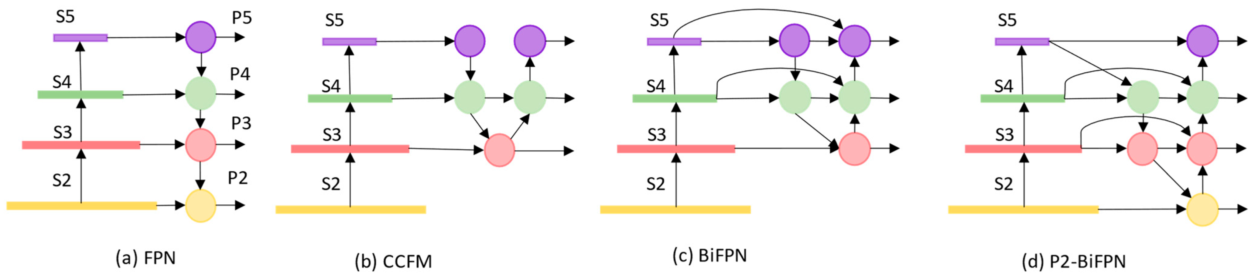 Bidirectional Feature Pyramid Network (BiFPN) further refines the multi-scale fusion process by introducing bidirectional pathways (top-down and bottom-up) and learnable weighting mechanisms, allowing the network to adaptively assign importance across different scales. This facilitates a more balanced integration of semantic and detailed information. In addition, BiFPN directly connects higher-level semantic features (from S4 and S5) with shallower layers, enhancing inter-level correlation and mitigating information loss during deep propagation. Nevertheless, BiFPN still underutilizes high-resolution features from the P2 layer. Directly incorporating P2 features can introduce redundancy and computational overhead, which compromises real-time performance and lightweight design key requirements for UAV-based or resource-constrained platforms.