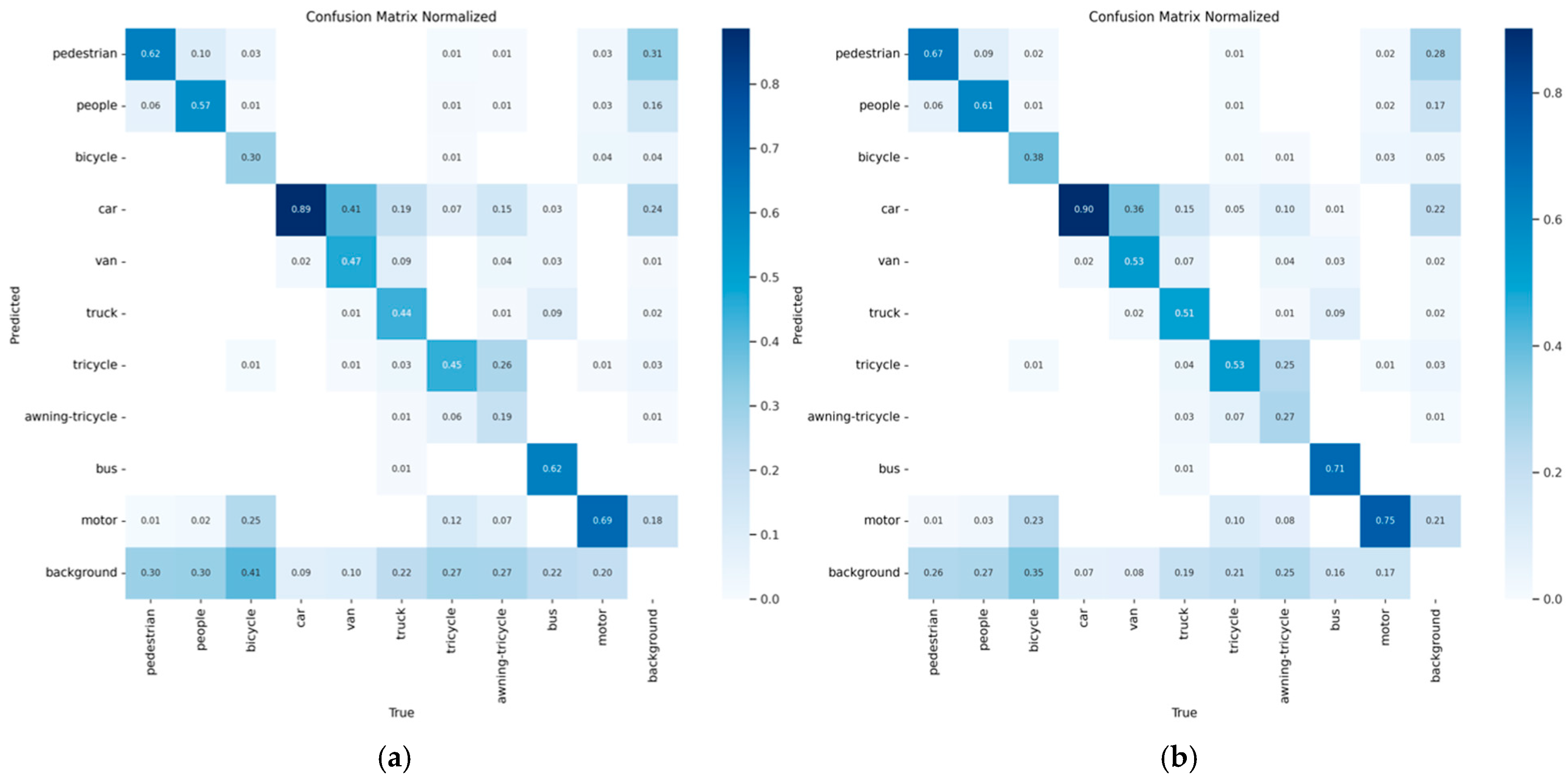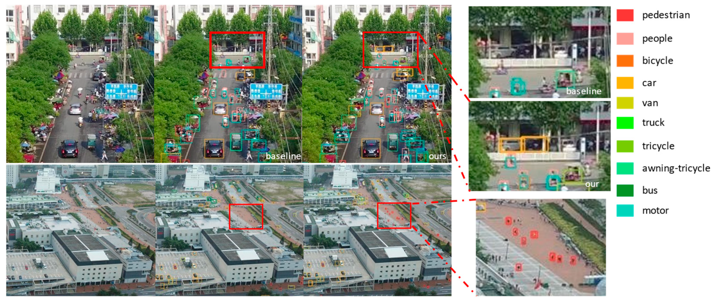 Overall, the C2f-EMA module significantly strengthens feature representation and spatial perception through multi-branch fusion and multi-scale attention mechanisms. Compared with the BasicBlock, it captures fine-grained details and key semantic regions more effectively, achieving superior accuracy and computational efficiency in small object detection particularly suitable for resource-constrained aerial applications.