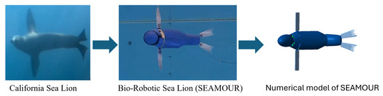 From biological system to engineered platform: California sea lion (left), bio-robotic sea lion (SEAMOUR—center), and numerical model (right).