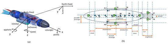 The mass matrix in symbolic form for the entire model is provided in Supplementary Material File S1. The principal and product moments of inertia were calculated using a computer-aided design (CAD) model of SEAMOUR on CREO [Creo Parametric, PTC, Boston, MA, USA]. In addition to these inertial parameters, the total mass of the main body was adjusted to include the additional water mass from the UUV’s flooded section. The CAD model was used to determine the geometrical properties of the main body and its various segments, while each body segment was individually weighed to determine its dry mass. The mass and geometric parameters used in the numerical model of SEAMOUR are summarized in Table 1.