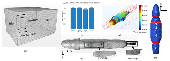 Computational fluid dynamics (CFD) simulations were developed to determine the force coefficients in all directions for each body segment of SEAMOUR (Figure 6). The CAD geometry of the main body was directly imported into COMSOL Multiphysics 6.3, where a user-controlled mesh was utilized, with the element size calibrated for fluid dynamics (Figure 6a,c). A fine mesh resolution was selected with free tetrahedral elements. The calculated force coefficients were insensitive to mesh resolution (Figure 6b). The maximum and minimum element sizes were 0.184m and 0.0346m, respectively. The maximum element growth rate was 1.13 with a curvature factor of 0.5, and the resolution of narrow regions was set at 0.8. The complete mesh contained 4.04 × 106 domain elements. The entire computational domain was 5 m × 4 m × 3 m (Figure 6a). A k–ε turbulence model was used, with an inflow velocity of 10 m/s applied across the model domain (Re ~). No slip boundary condition was used for the walls. To calculate the force coefficients, the line integral of the total stress along the boundaries of each geometry was evaluated, yielding force coefficients along the X, Y, and Z axes. For the X-direction force coefficient of the main body (Figure 6d), the full CAD assembly was imported into COMSOL. For force coefficients in the y and z directions, each body segment was imported individually (Figure 6e), and CFD simulations were run separately to obtain the segment-specific coefficients. Similarly, for both the fore flippers and hind flippers, each flipper’s geometry was analyzed independently to compute force coefficients in all three directions. Drag forces acting on the main body, head, pelvis, and flippers were calculated using (20). Additionally, the velocities at the center of mass nodes were sensed and subsequently used to compute forces at the center of mass nodes of each flipper as well as the body segment. The NodeVelocity function in ProPac was used to sense the velocities at every node of the numerical model [22]. More information on this can be found in the attached Supplementary Materials. The drag force equation is