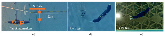 SEAMOUR was tested in a pool measuring 9 m × 9 m × 4 m (length × width × depth), where videos were recorded to capture its position and orientation across different trials. To ensure a consistent starting position and orientation, the robot was magnetically attached at its midsection to an aluminum docking structure mounted against one wall of the pool. The docking system included a magnetic end effector with prongs to secure the robot prior to each trial. All experiments were conducted at a depth of approximately 1.22 m. Video footage was captured using a GoPro Hero 13 (GoPro, San Mateo, CA, USA) mounted on the adjacent pool wall, recording at 30 frames per second in 4K resolution. A reference scale with a known length was used in the field of view to convert pixel measurements to meters. Processed clips were then imported into MATLAB, where the Image Processing and Computer Vision Toolboxes were used to track the robot’s motion. Two visual markers (Figure 7a), placed on the head and pelvis shells, were used to extract position and pitch angle data over the duration of each trial. During maneuver tests, orientation data were also recorded by an onboard inertial measurement unit (BNO085, PN 4754, Adafruit, Brooklyn, NY, USA), at a sampling rate of 20 Hz. Each maneuver trial began with three paddle strokes to bring SEAMOUR up to speed, followed by simultaneous actuation of the head and pelvis sections. The fore flippers were kept in a streamlined configuration and were not actuated during maneuvers. Although the fore flippers used for these tests were flexible and similar to those described in [42], they were treated as rigid for the purposes of this analysis. Since they were not actuated during the trials, their influence on overall performance was considered negligible. Separate video recordings were made for different types of maneuvers. For pitch trials (Figure 7b), the camera was mounted on the side wall, and for yaw trials (Figure 7c), a camera was placed on the bottom of the pool. To ensure fair comparison with numerical simulations, each simulation was initialized with the same pre-actuation velocity measured from experiments (approximately 0.21 m/s). Three trials were conducted for each test condition, and the results were averaged to quantify the robot’s position and orientation.