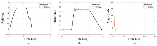 Across different input trajectories, the tracking controllers consistently generated outputs that closely aligned with the desired input signals. The flipper roll trajectory was tracked near perfectly (Figure 8a). When the pelvis pitch trajectory was implemented, the tracking controller achieved a 2% settling time of 0.58 s (Figure 8b). Furthermore, for a steady-state input of zero with an initial condition of 0.6 radians, the controller exhibited a 2% settling time of just 0.017 s (Figure 8c), demonstrating strong agreement between input and output.