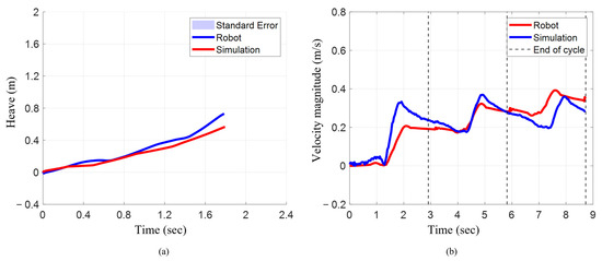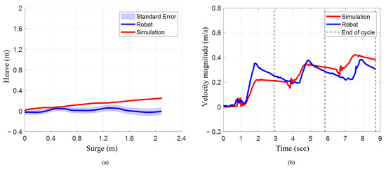 Position and resultant velocity magnitude when executing characteristic stroke. (a) Surge vs. heave for robot and simulation. (b) Resultant velocity magnitude.