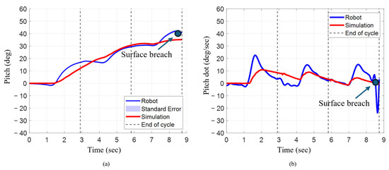 The numerical model’s prediction for the final pitch angle, as well as maximum and mean angular velocity across the four seconds during a pitch maneuver, very closely matched the bio-robotic system. The numerical model predicted a final pitch angle of 44.27° at the end of four seconds. On the other hand, the bio-robotic system produced a total pitch angle of 42.40°, which was only approximately 4% lower (Figure 13a). In addition, the maximum and mean pitch velocity across the four-second duration for the numerical model were 41.17°/s and 11.27°/s (Figure 13b). When compared to the numerical model, the maximum pitch velocity for the robot was only about 4% higher. Additionally, the mean pitch velocity for the robot was only approximately 6% lower when compared to the numerical model.