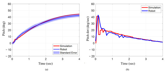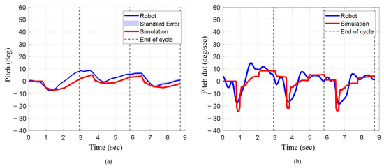Orientation and angular rate for robot and simulation during characteristic stroke with pelvis actuated. (a) Pitch angle changes across three strokes. (b) Angular velocity across three strokes.