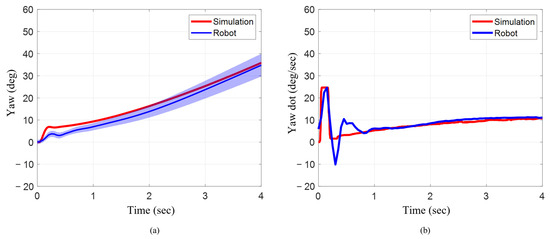 Like the pitch maneuver, when the head and pelvis were actuated for a yaw maneuver, the final yaw angle, and the maximum and mean angular velocity across the four-second duration, showed very close alignment between the numerical model and the robotic system. The final yaw angle for the numerical model at the end of four seconds was 35.84° (Figure 14a). For the robotic system, the final yaw angle was 34.80°, which was just 3% lower. The maximum and mean angular velocity across four seconds in the numerical model were 24.67°/s and 8.10°/s, respectively (Figure 14b). Similarly, the maximum angular velocity across the total duration for the robotic system was 24.63°/s, which was less than 2% lower. The mean angular velocity of the robotic system was 8.70°/s, which corresponded to an approximate increase of about 7% when compared to the numerical model. To see each of the swimming and maneuver trials executed on the bio-robotic platform and its numerical model, please refer to the following Supplementary Video S1: gavideo.