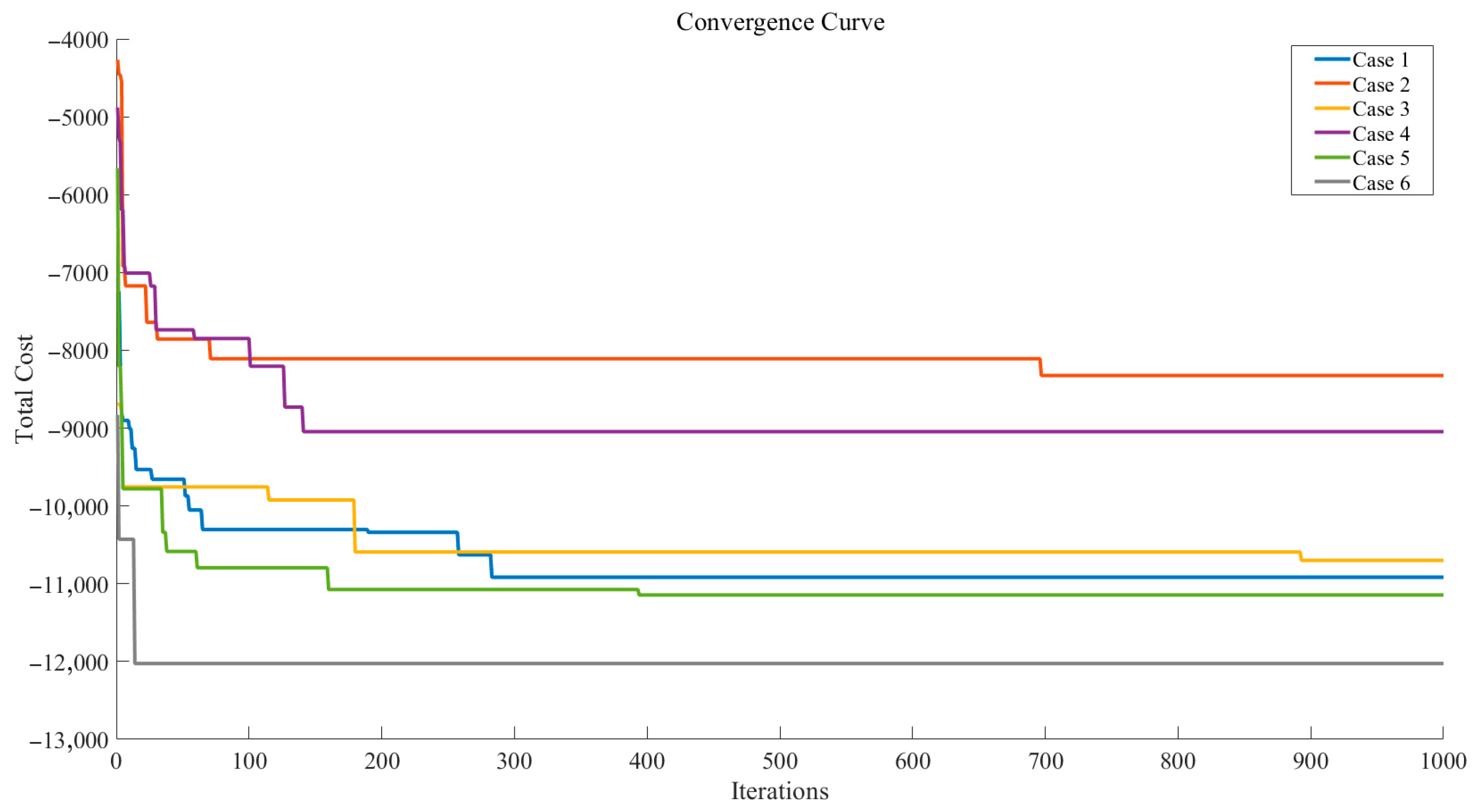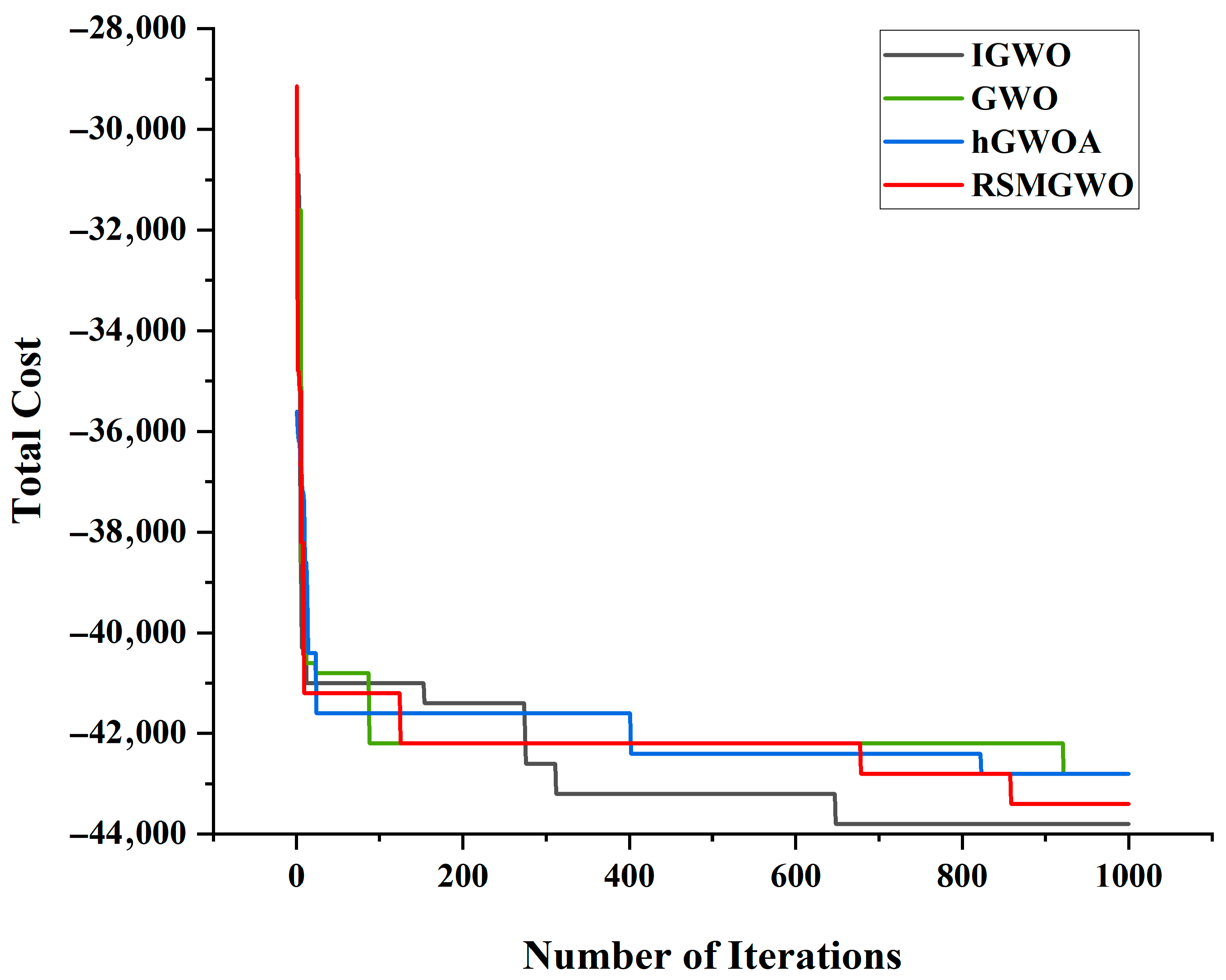 - Design of an Enhanced Metaheuristic Solution Strategy: An Improved Grey Wolf Optimizer (IGWO) is introduced, incorporating Latin hypercube sampling to ensure uniform initialization of the population. The algorithm further integrates an evolutionary factor mechanism based on simulated binary crossover (SBX) and three leadership-guided parents (Alpha, Beta, Delta) to strengthen global exploration. A greedy mutation-based opposition learning strategy is applied to the lowest-performing quarter of the population, enabling effective local refinement and accelerating convergence toward high-quality solutions.