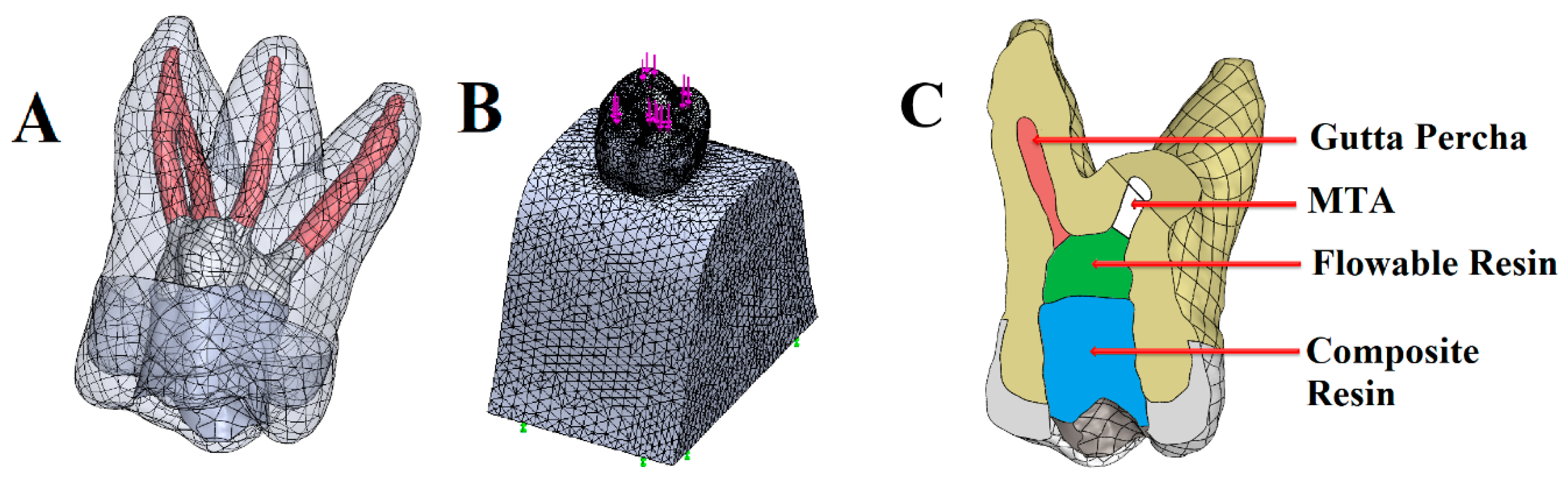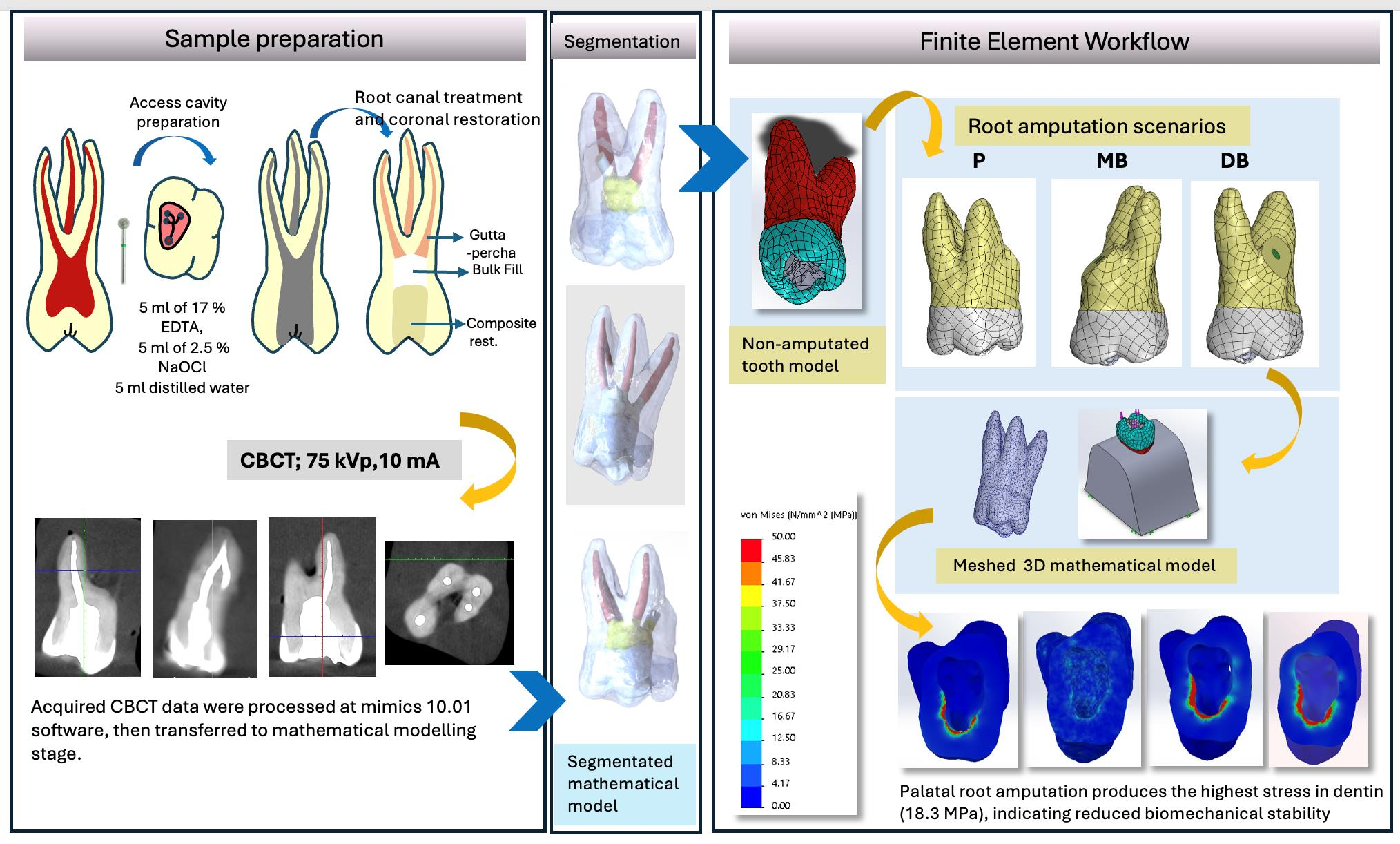 Therefore, this study aimed to comparatively evaluate the stress distribution, stress concentration zones, and fracture risk in root dentin and the surrounding bone tissue in endodontically treated maxillary first molars retrogradely filled with Mineral Trioxide Aggregate (MTA) following root amputation, using Finite Element Analysis (FEA). The null hypothesis of this study is that amputating different roots in maxillary molars does not affect the maximum stress values and areas of stress concentration in root dentin and the alveolar bone.