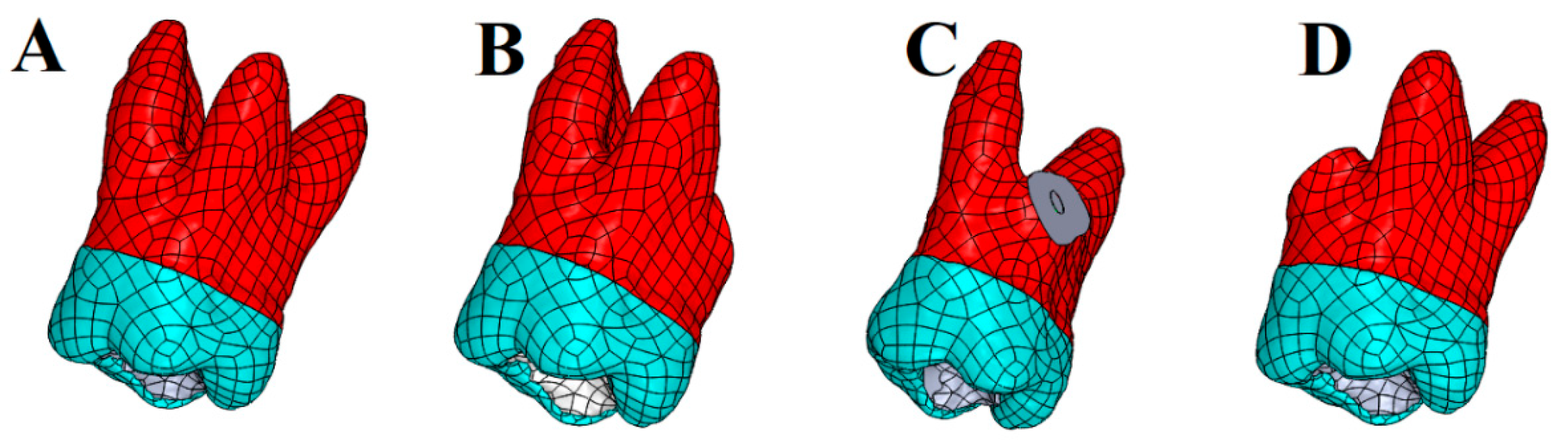 A reconstructed model of a maxillary molar that had been endodontically treated without receiving root amputation was initially created as the main model (Model 1—Endodontically treated tooth (not resected)). This reference model was then digitally duplicated, and each duplicate was systematically modified to simulate one of the surgical procedures under investigation. The modifications were confined exclusively to the type and extent of surgical intervention, ensuring that all other anatomical and structural parameters remained consistent across the models.