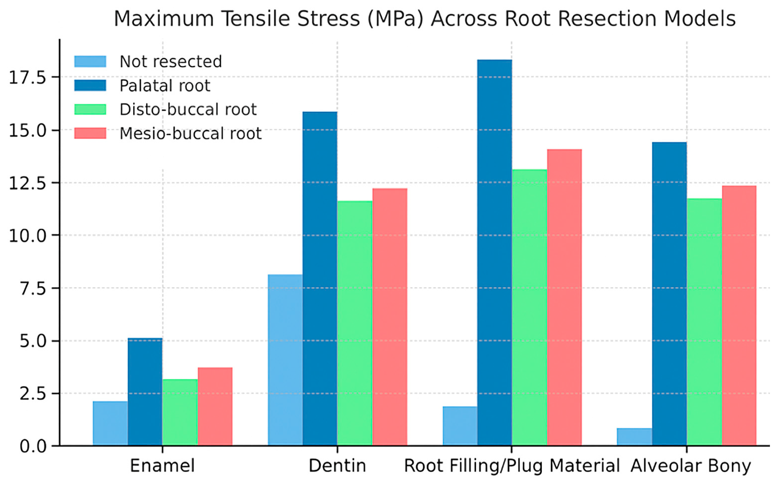 Figure 4). Among the resected models, the palatal root resection exhibited the highest tensile stress values across all tissues (18.33 MPa), followed by the mesio-buccal root resection (14.09 MPa) and the disto-buccal root resection (13.10 MPa). The non-resected tooth model recorded the lowest maximum tensile stress value (8.14 MPa). The highest tensile stress values observed in the enamel, dentin, and root canal filling materials across the different models are summarized in