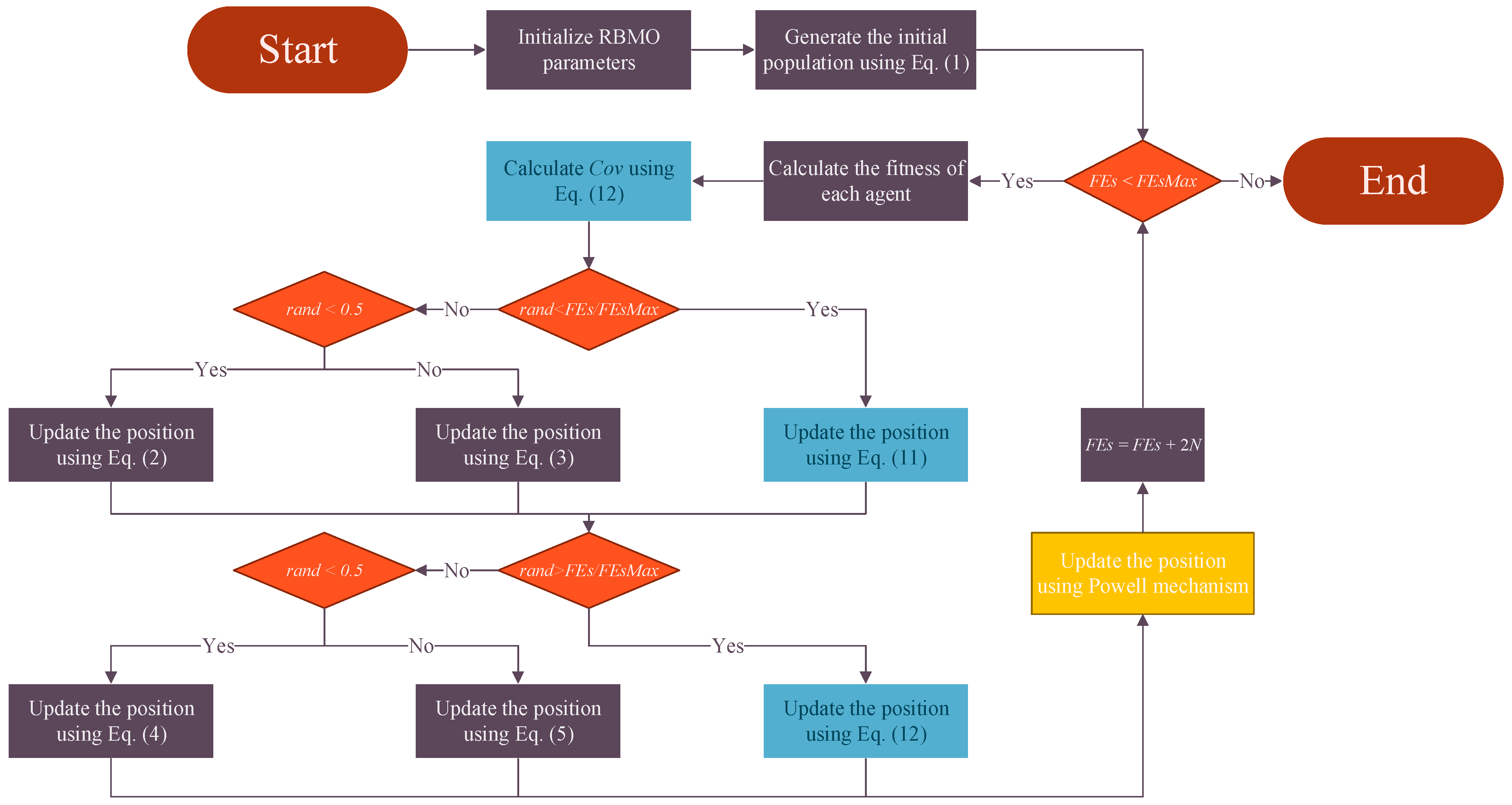 | 1: Initialize the RBMO parameters 2: Initialize the population X using Equation (1) 3: While FEs < FEsMax 4: Construct using Equation (8)//DTC 5: For i = 1: N do 6: //Exploration// 7: If rand < Then 8: Update position of ith agent using Equation (11)//DTC 9: Eles 10: If rand < 0.5 Then 11: Update position of ith agent using Equation (2)//Search for food 12: Eles 13: Update position of ith agent using Equation (3)//Search for food 14: End if 15: End if 16: //Exploitation// 17: If rand > Then 18: Update position of ith agent using Equation (12)//DTC 19: Eles 20: If rand < 0.5 Then 21: Update position of ith agent using Equation (4)//Attacking prey 22: Eles 23: Update position of ith agent using Equation (5)//Attacking prey 24: End if 25: End if 26: End for 27: FEs = FEs + 2N 28: If FEs > Then 29: Update position of Xfood (the best agent) using Powell mechanism//PM 30: End if 31: End while 32: Return the best solution Xfood |