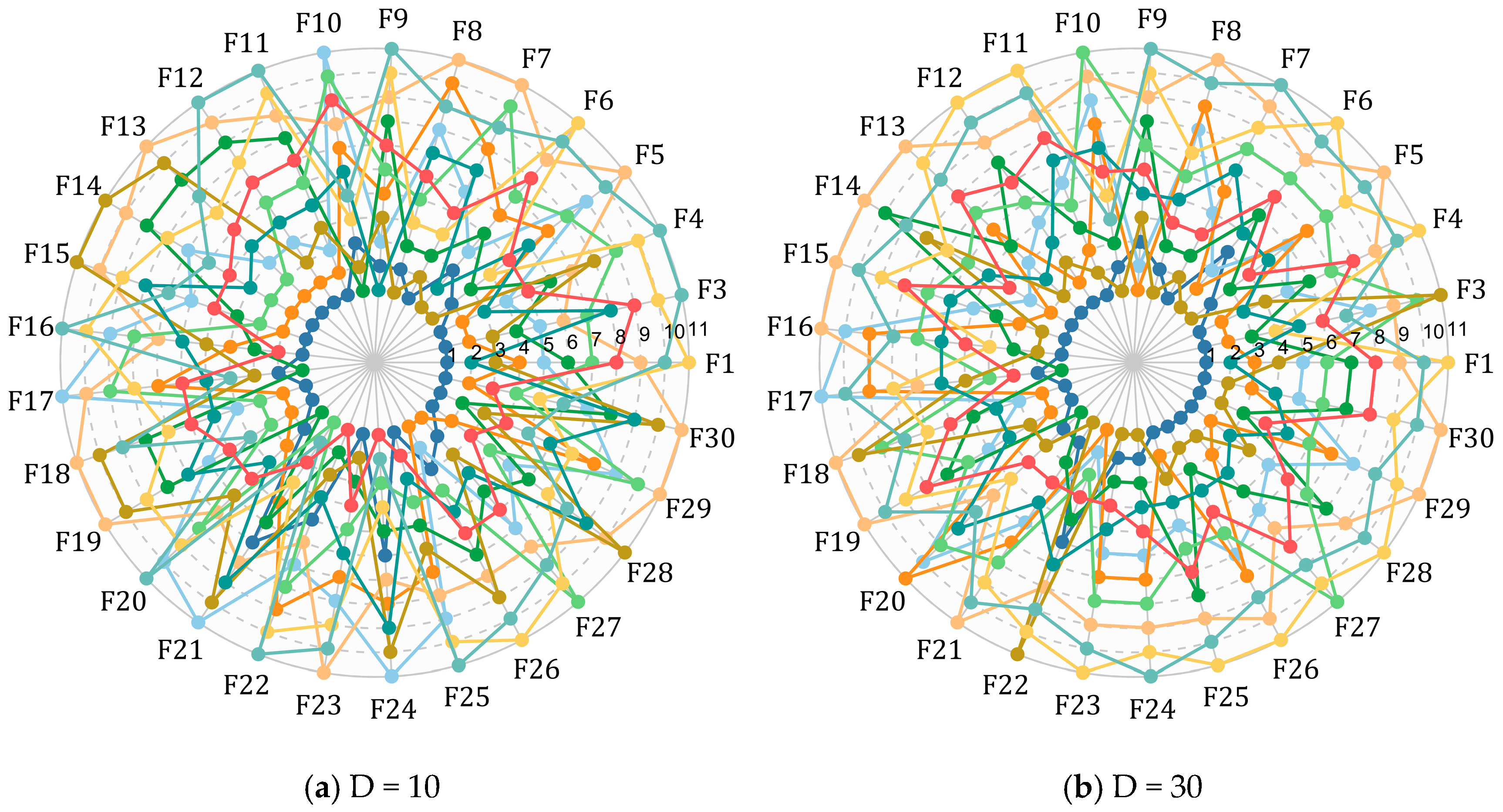 | CEC 2017 | 10 | 1.931 | 6.724 | 4.448 | 9.138 | 5.103 | 6.034 | 5.690 | 7.931 | 5.517 | 8.345 | 5.138 | 2.57E−18 |