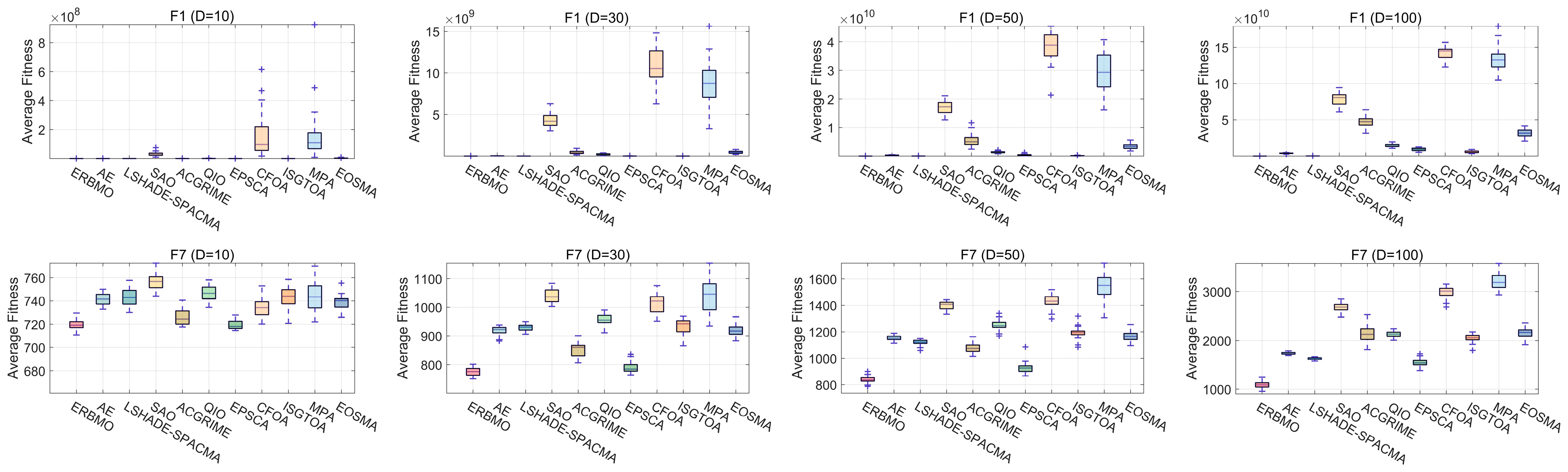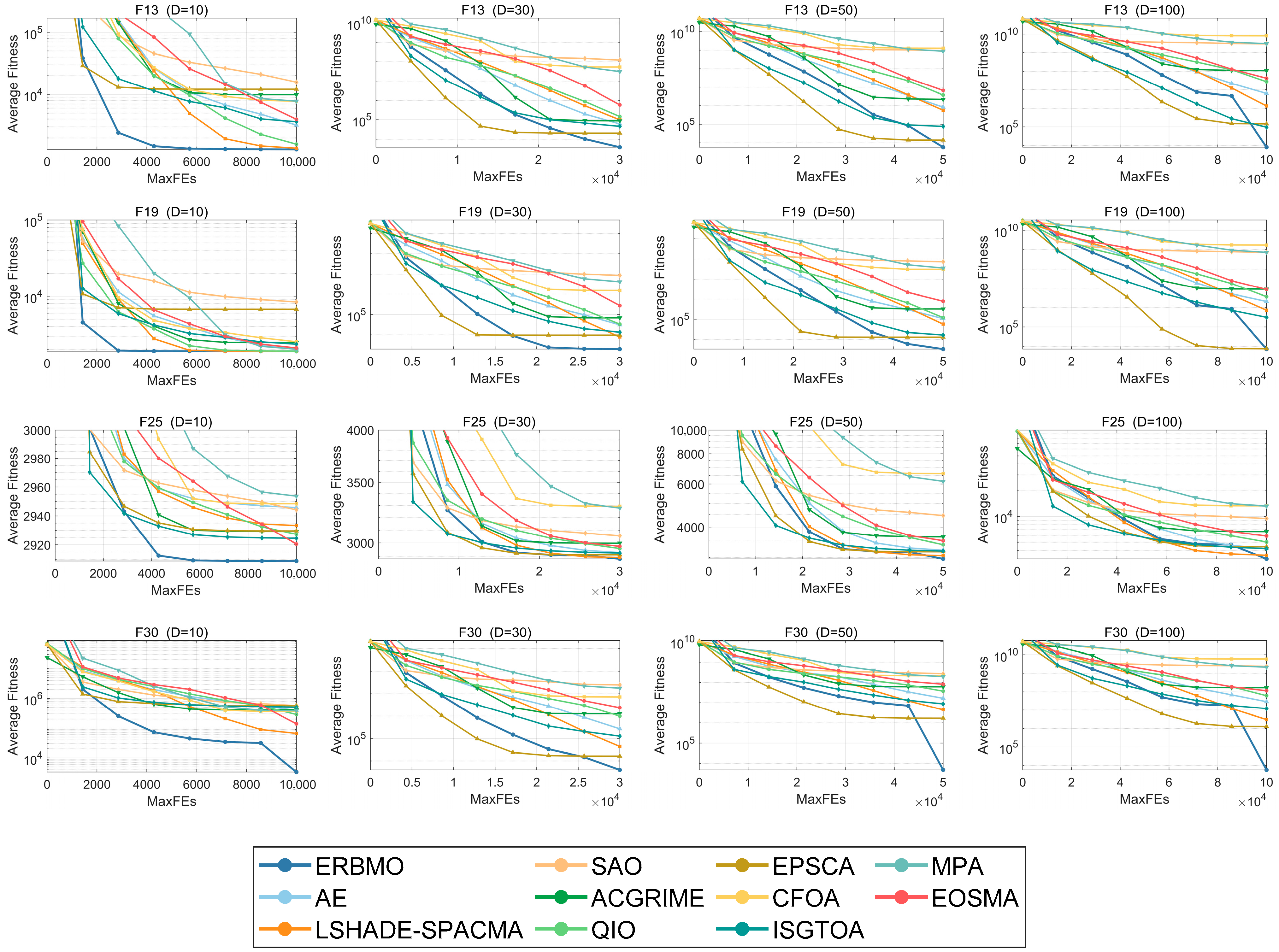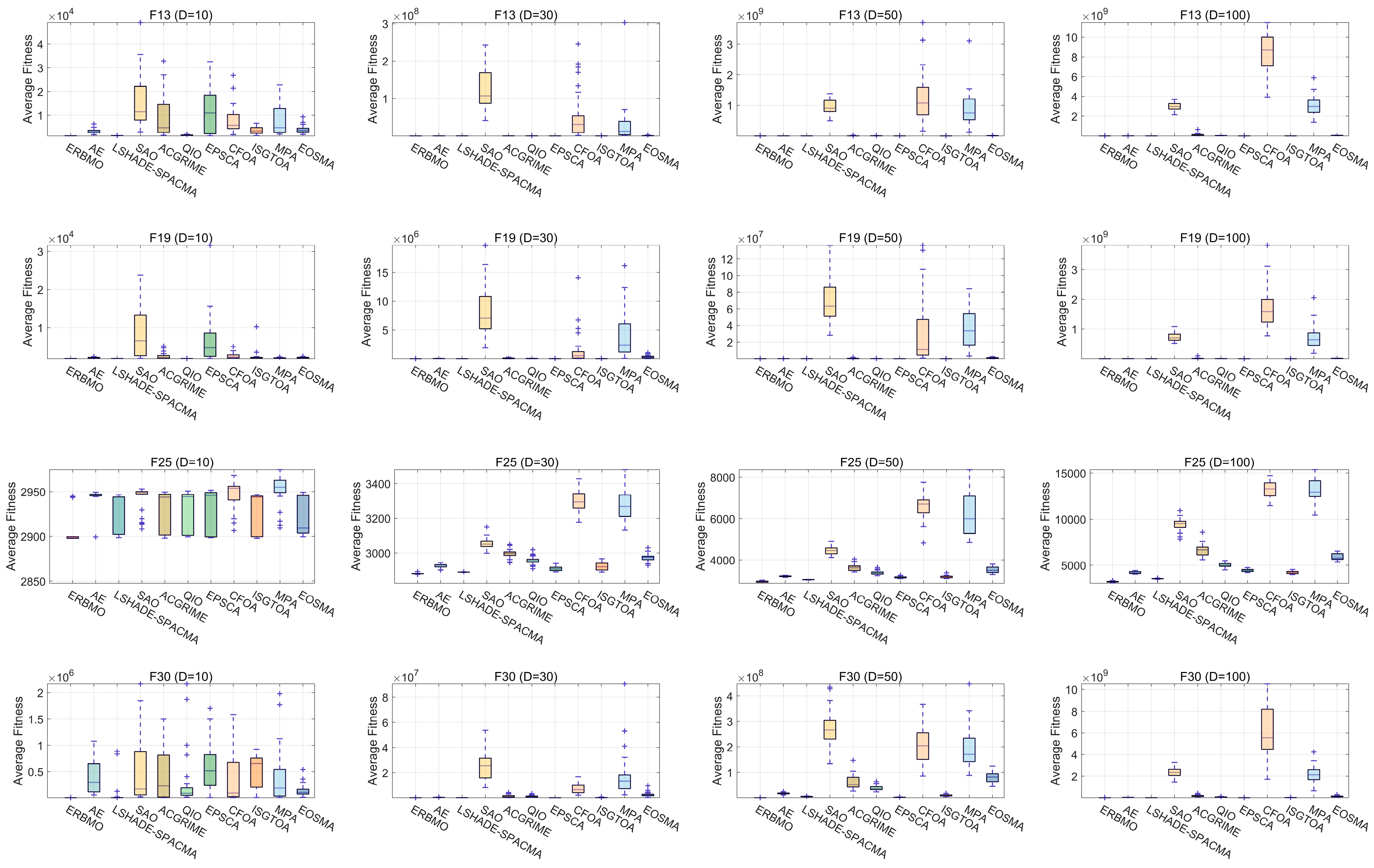 | Test Suite | Dimension | ERBMO | AE | LSHADE-SPACMA | SAO | ACGRIME | QIO | EPSCA | CFOA | ISGTOA | MPA | EOSMA | p-Value |